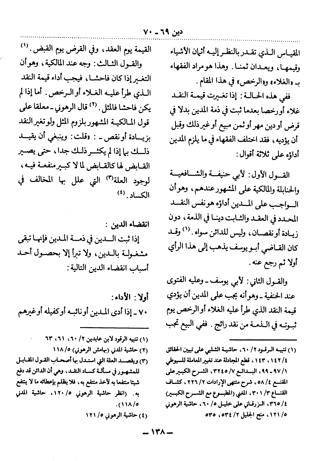 (3) ويقصد العلة التي استدل بها أصحاب القول المقابل للمشهور في مسألة كساد النقد، وهي أن الدائن قد دفع شيئًا منتفعًا به لأخذ منتفع به، فلا يظلم بإعطائه ما لا ينتفع به. (انظر حاشية الرهوني 5 / 120، حاشية المدني 5 / 118)