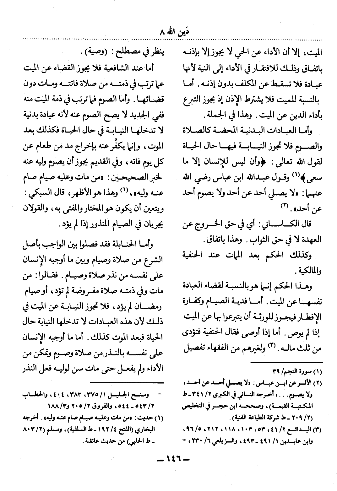 (2) الأثر عن ابن عباس: " لا يصلي أحد عن أحد، ولا يصوم. . . " أخرجه النسائي في الكبرى 2 / 314 - ط المكتبة القيمة، وصححه ابن حجر في التلخيص (2 / 209 - ط شركة الطباعة الفنية) .