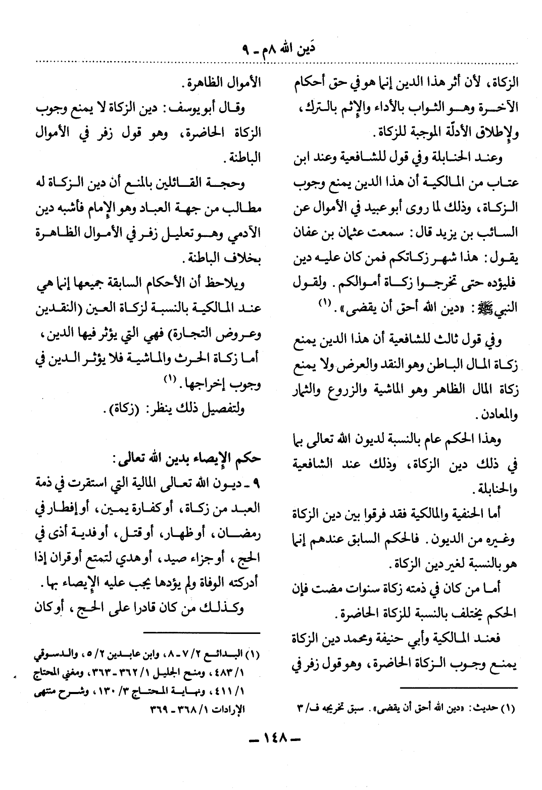 وَحُجَّةُ الْقَائِلِينَ بِالْمَنْعِ أَنَّ دَيْنَ الزَّكَاةِ لَهُ مُطَالِبٌ مِنْ جِهَةِ الْعِبَادِ وَهُوَ الإِْمَامُ فَأَشْبَهَ دَيْنَ الآْدَمِيِّ وَهُوَ تَعْلِيل زُفَرَ فِي الأَْمْوَال الظَّاهِرَةِ بِخِلاَفِ الْبَاطِنَةِ. وَيُلاَحَظُ أَنَّ الأَْحْكَامَ السَّابِقَةَ جَمِيعُهَا إِنَّمَا هِيَ عِنْدَ الْمَالِكِيَّةِ بِالنِّسْبَةِ لِزَكَاةِ الْعَيْنِ (النَّقْدَيْنِ وَعُرُوضِ التِّجَارَةِ) فَهِيَ الَّتِي يُؤَثِّرُ فِيهَا الدَّيْنُ، أَمَّا زَكَاةُ الْحَرْثِ وَالْمَاشِيَةِ فَلاَ يُؤَثِّرُ الدَّيْنُ فِي وُجُوبِ إِخْرَاجِهَا (1) . وَلِتَفْصِيل ذَلِكَ يُنْظَرُ: (زَكَاة) .