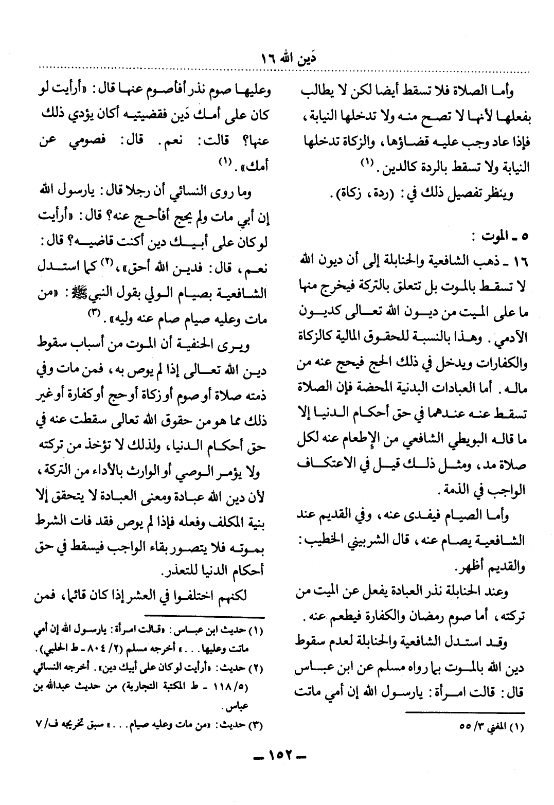 16 - ذَهَبَ الشَّافِعِيَّةُ وَالْحَنَابِلَةُ إِلَى أَنَّ دُيُونَ اللَّهِ لاَ تَسْقُطُ بِالْمَوْتِ بَل تَتَعَلَّقُ بِالتَّرِكَةِ فَيَخْرُجُ مِنْهَا مَا عَلَى الْمَيِّتِ مِنْ دُيُونِ اللَّهِ تَعَالَى كَدُيُونِ الآْدَمِيِّ. وَهَذَا بِالنِّسْبَةِ لِلْحُقُوقِ الْمَالِيَّةِ كَالزَّكَاةِ وَالْكَفَّارَاتِ وَيَدْخُل فِي ذَلِكَ الْحَجُّ فَيُحَجُّ عَنْهُ مِنْ مَالِهِ. أَمَّا الْعِبَادَاتُ الْبَدَنِيَّةُ الْمَحْضَةُ فَإِنَّ الصَّلاَةَ تَسْقُطُ عَنْهُ عِنْدَهُمَا فِي حَقِّ أَحْكَامِ الدُّنْيَا إِلاَّ مَا قَالَهُ الْبُوَيْطِيُّ الشَّافِعِيُّ مِنَ الإِْطْعَامِ عَنْهُ لِكُل صَلاَةٍ مُدٌّ، وَمِثْل ذَلِكَ قِيل فِي الاِعْتِكَافِ الْوَاجِبِ فِي الذِّمَّةِ. وَأَمَّا الصِّيَامُ فَيُفْدَى عَنْهُ، وَفِي الْقَدِيمِ عِنْدَ الشَّافِعِيَّةِ يُصَامُ عَنْهُ، قَال الشِّرْبِينِيُّ الْخَطِيبُ وَالْقَدِيمُ أَظْهَرُ.