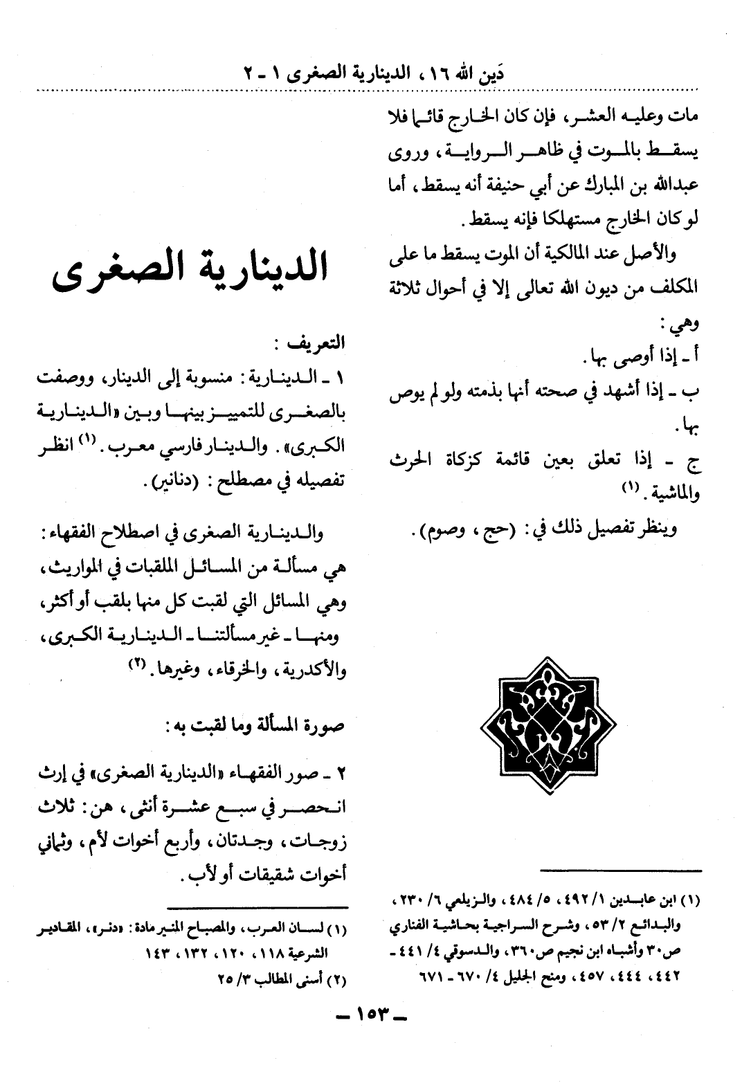 1 - الدِّينَارِيَّةُ: مَنْسُوبَةٌ إِلَى الدِّينَارِ، وَوُصِفَتْ بِالصُّغْرَى لِلتَّمْيِيزِ بَيْنَهَا وَبَيْنَ " الدِّينَارِيَّةُ الْكُبْرَى ". وَالدِّينَارُ فَارِسِيٌّ مُعَرَّبٌ (1) . انْظُرْ تَفْصِيلَهُ فِي مُصْطَلَحِ: (دَنَانِيرُ) . وَالدِّينَارِيَّةُ الصُّغْرَى فِي اصْطِلاَحِ الْفُقَهَاءِ: هِيَ مَسْأَلَةٌ مِنَ الْمَسَائِل الْمُلَقَّبَاتِ فِي الْمَوَارِيثِ، وَهِيَ الْمَسَائِل الَّتِي لُقِّبَتْ كُلٌّ مِنْهَا بِلَقَبٍ أَوْ أَكْثَرَ، وَمِنْهَا - غَيْرَ مَسْأَلَتِنَا - الدِّينَارِيَّةُ الْكُبْرَى، وَالأَْكْدَرِيَّةُ، وَالْخَرْقَاءُ، وَغَيْرُهَا (2) .