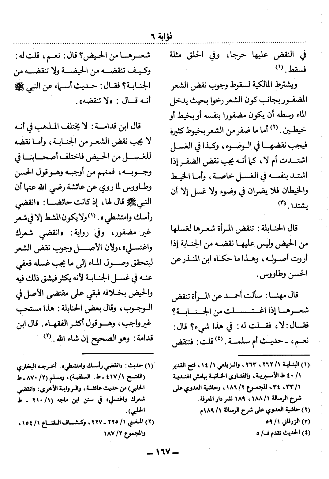 (1) حديث: " انقضى رأسك وامتشطي " أخرجه البخاري (الفتح 1 / 417 - ط. السلفية) ، ومسلم (2 / 870 - ط الحلبي) من حديث عائشة، والرواية الأخرى: " انقضي شعرك واغتسلي " في سنن ابن ماجه (1 / 210 - ط الحلبي) .