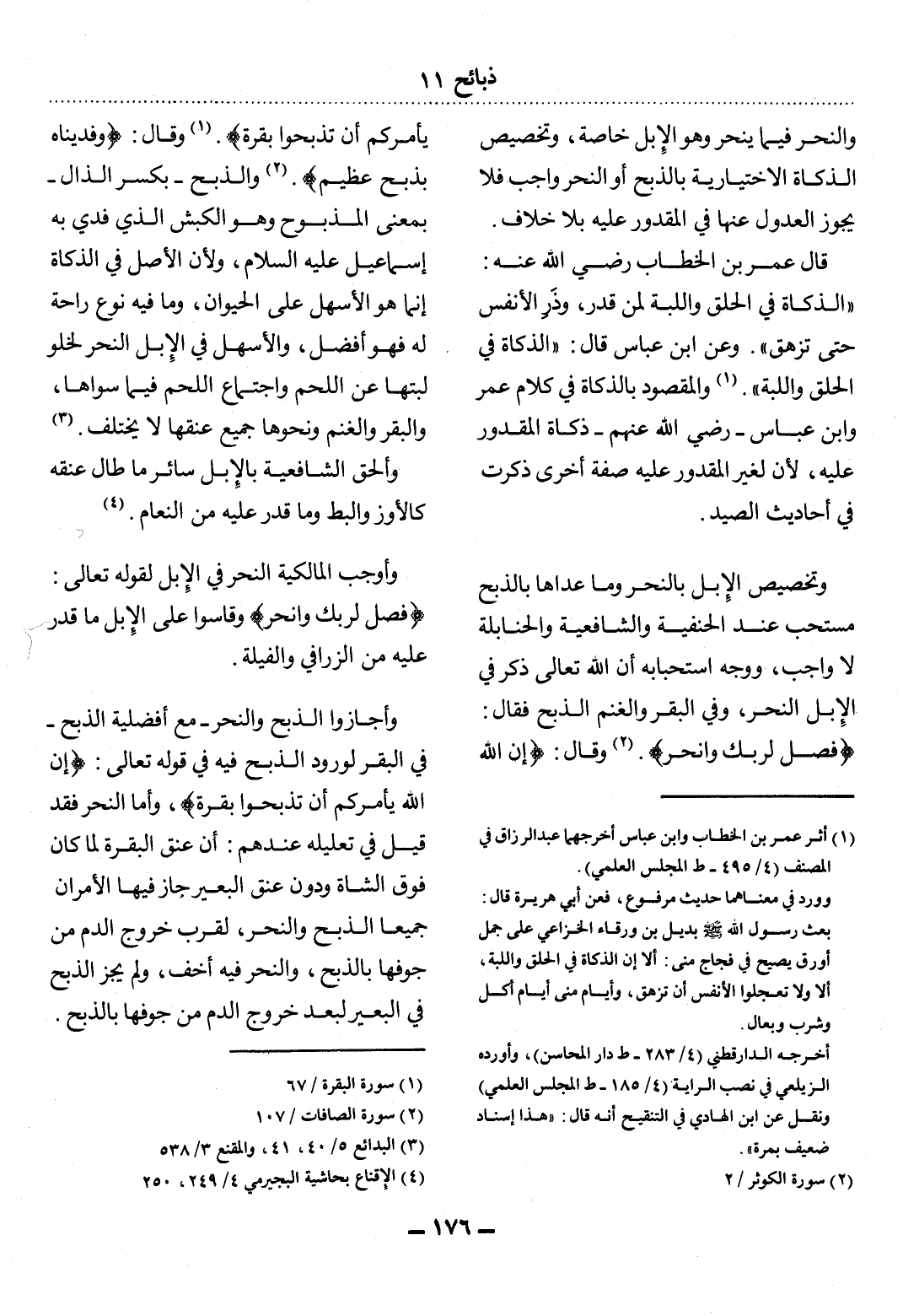 (1) أثر عمر بن الخطاب وابن عباس أخرجهما عبد الرزاق في المصنف (4 / 495 - ط المجلس العلمي) . وورد في معناهما حديث مرفوع، فعن أبي هريرة قال: بعث رسول الله صلى الله عليه وسلم بديل بن ورقاء الخزاعي على جمل أورق يصيح في فجاج منى: ألا إن الذكاة في الحلق واللبة وأورده الزيلعي في نصب الراية (4 / 185 - ط المجلس العلمي) ، ونقل عن ابن الهادي في التنقيح أنه قال: " هذا إسناد ضعيف بمرة ".