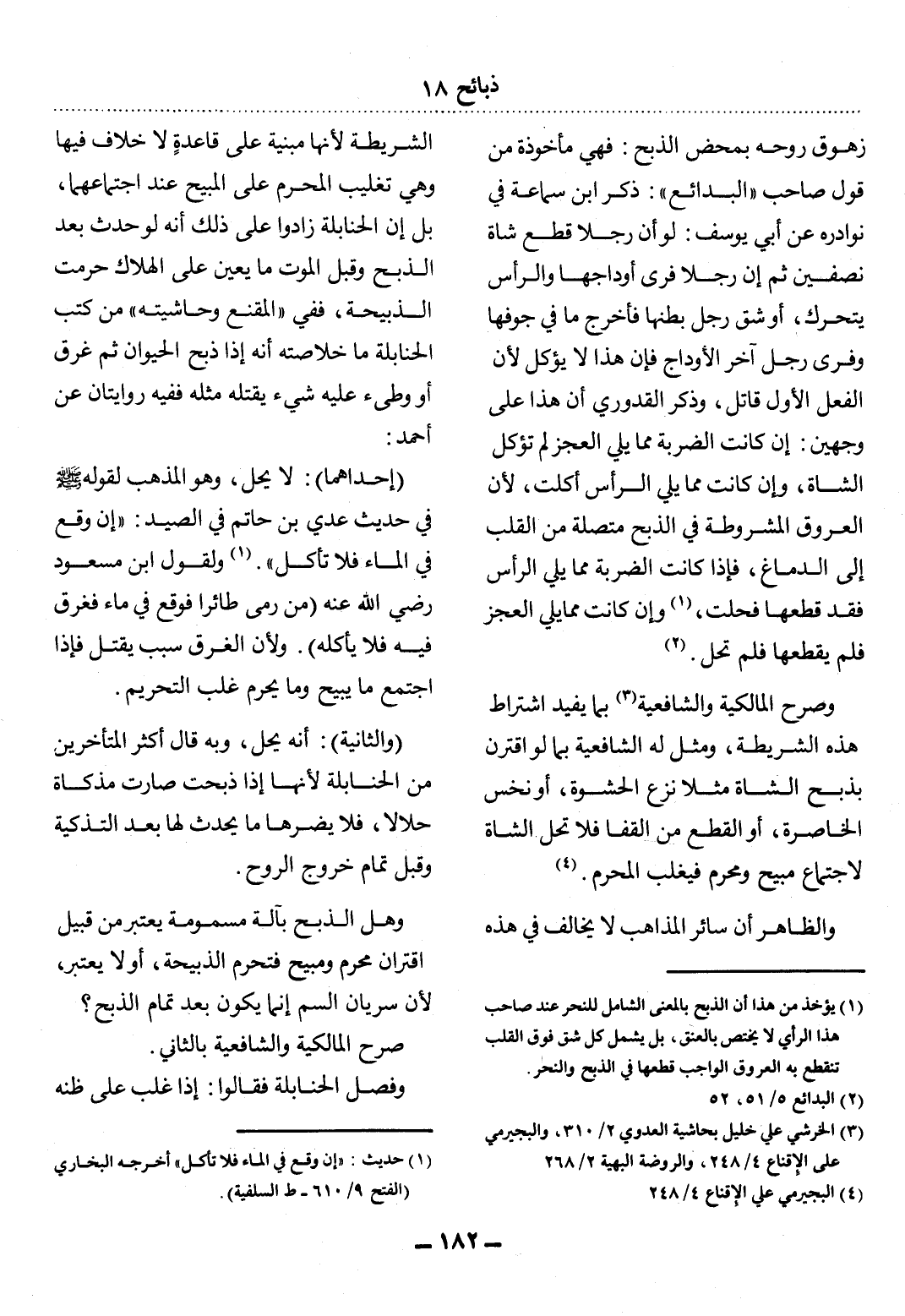 (1) يؤخذ من هذا أن الذبح بالمعنى الشامل للنحر عند صاحب هذا الرأي لا يختص بالعنق، بل يشمل كل شق فوق القلب تنقطع به العروق الواجب قطعها في الذبح والنحر.
