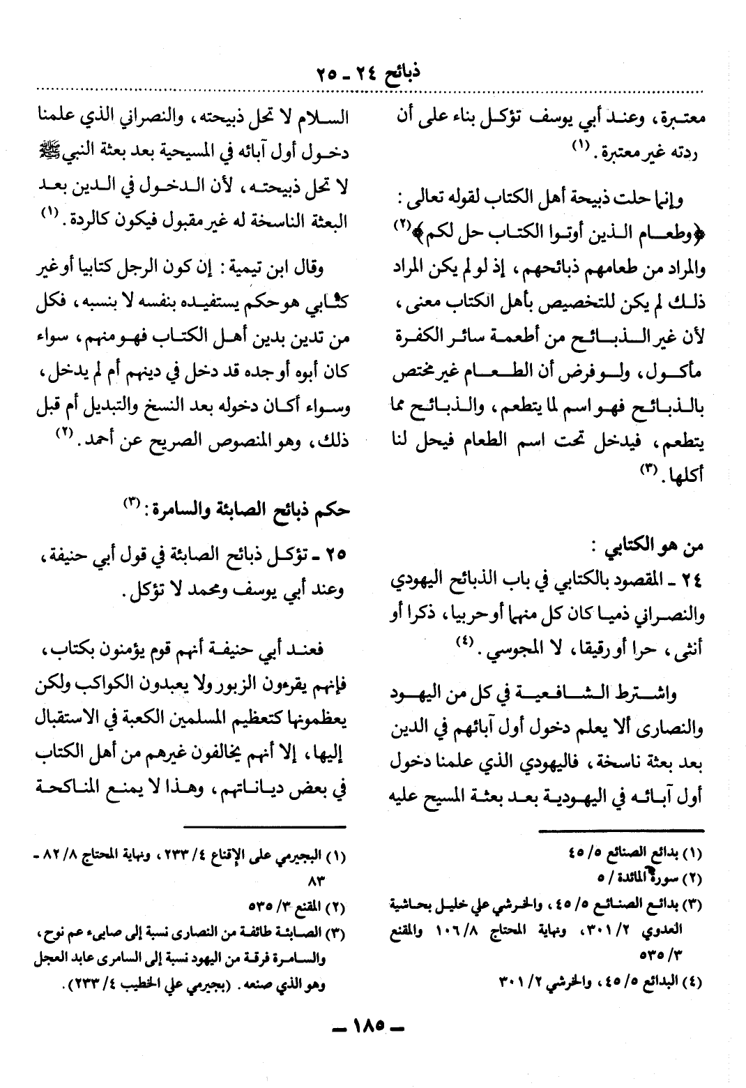 24 - الْمَقْصُودُ بِالْكِتَابِيِّ فِي بَابِ الذَّبَائِحِ الْيَهُودِيُّ وَالنَّصْرَانِيُّ ذِمِّيًّا كَانَ كُلٌّ مِنْهُمَا أَوْ حَرْبِيًّا، ذَكَرًا أَوْ أُنْثَى، حُرًّا أَوَرَقِيقًا، لاَ الْمَجُوسِيُّ. (4)