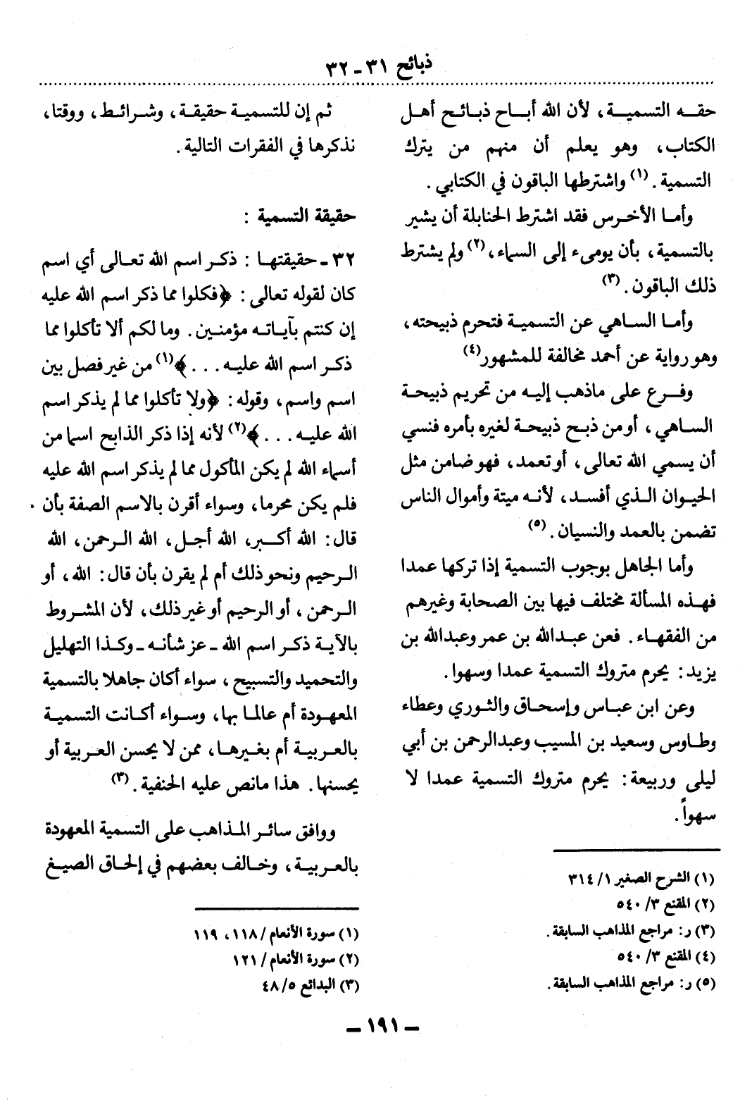 32 - حَقِيقَتُهَا: ذِكْرُ اسْمِ اللَّهِ تَعَالَى أَيَّ اسْمٍ كَانَ لِقَوْلِهِ تَعَالَى: {فَكُلُوا مِمَّا ذُكِرَ اسْمُ اللَّهِ عَلَيْهِ إِنْ كُنْتُمْ بِآيَاتِهِ مُؤْمِنِينَ وَمَا لَكُمْ أَلاَّ تَأْكُلُوا مِمَّا ذُكِرَ اسْمُ اللَّهِ عَلَيْهِ. . .} (1) مِنْ غَيْرِ فَصْلٍ بَيْنَ اسْمٍ وَاسْمٍ، وَقَوْلُهُ: {وَلاَ تَأْكُلُوا مِمَّا لَمْ يُذْكَرِ اسْمُ اللَّهِ عَلَيْهِ. . .} (2) لأَِنَّهُ إِذَا ذَكَرَ الذَّابِحُ اسْمًا مِنْ أَسْمَاءِ اللَّهِ لَمْ يَكُنِ الْمَأْكُول مِمَّا لَمْ يُذْكَرِ اسْمُ اللَّهِ عَلَيْهِ فَلَمْ يَكُنْ مُحَرَّمًا، وَسَوَاءٌ أَقَرَنَ بِالاِسْمِ الصِّفَةَ بِأَنْ قَال: اللَّهُ أَكْبَرُ، اللَّهُ أَجَل، اللَّهُ الرَّحْمَنُ، اللَّهُ الرَّحِيمُ وَنَحْوُ ذَلِكَ أَمْ لَمْ يَقْرِنْ بِأَنْ قَال: اللَّهُ أَوِ الرَّحْمَنُ أَوِ الرَّحِيمُ أَوْ غَيْرُ ذَلِكَ؛ لأَِنَّ الْمَشْرُوطَ بِالآْيَةِ ذِكْرُ اسْمِ اللَّهِ - عَزَّ شَأْنُهُ - وَكَذَا التَّهْلِيل وَالتَّحْمِيدُ وَالتَّسْبِيحُ، سَوَاءٌ أَكَانَ جَاهِلاً بِالتَّسْمِيَةِ الْمَعْهُودَةِ أَمْ عَالِمًا بِهَا، وَسَوَاءٌ أَكَانَتِ التَّسْمِيَةُ بِالْعَرَبِيَّةِ أَمْ بِغَيْرِهَا، مِمَّنْ لاَ يُحْسِنُ الْعَرَبِيَّةَ أَوْ يُحْسِنُهَا، هَذَا مَا نَصَّ عَلَيْهِ الْحَنَفِيَّةُ. (3)
