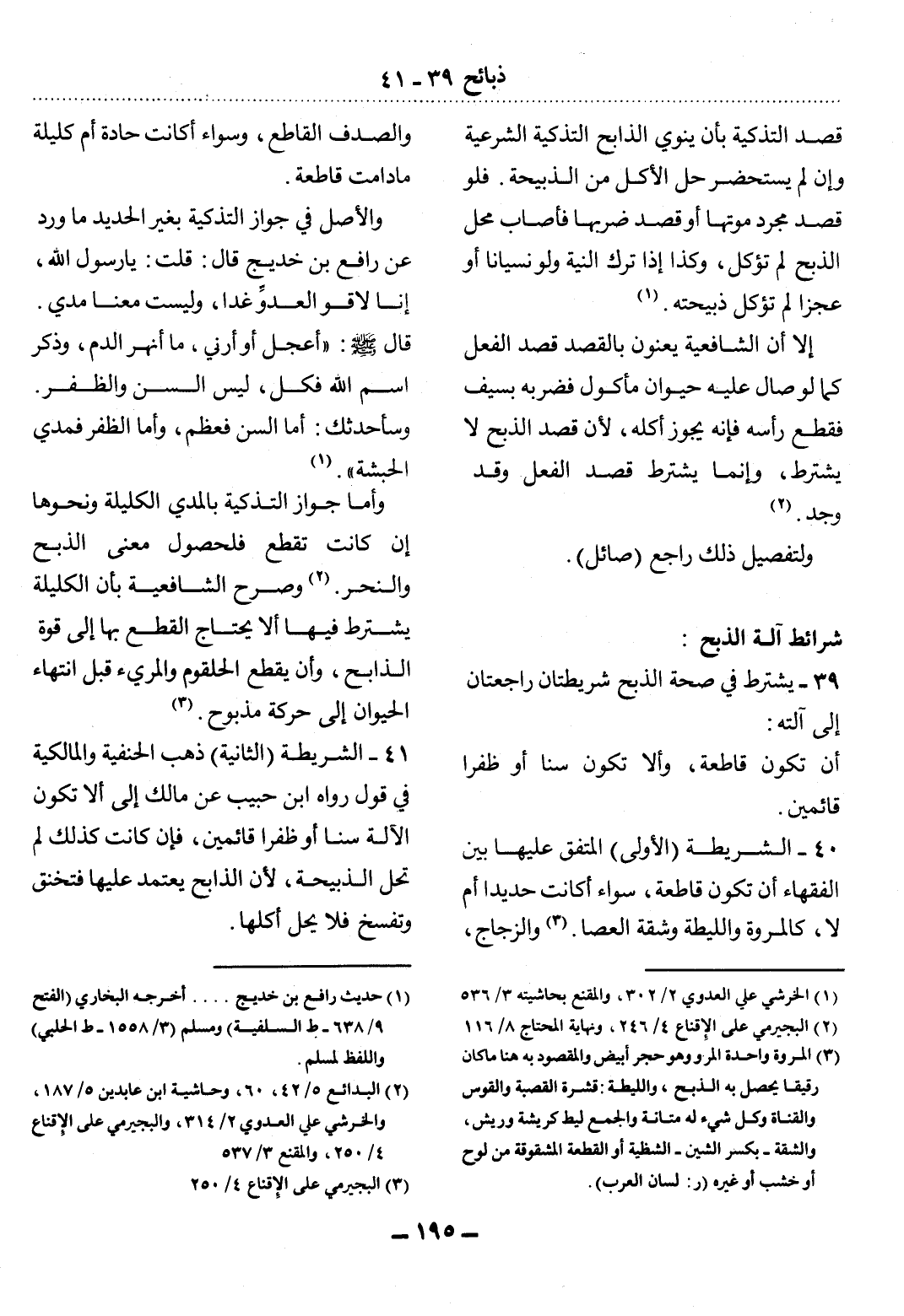 39 - يُشْتَرَطُ فِي صِحَّةِ الذَّبْحِ شَرِيطَتَانِ رَاجِعَتَانِ إِلَى آلَتِهِ: