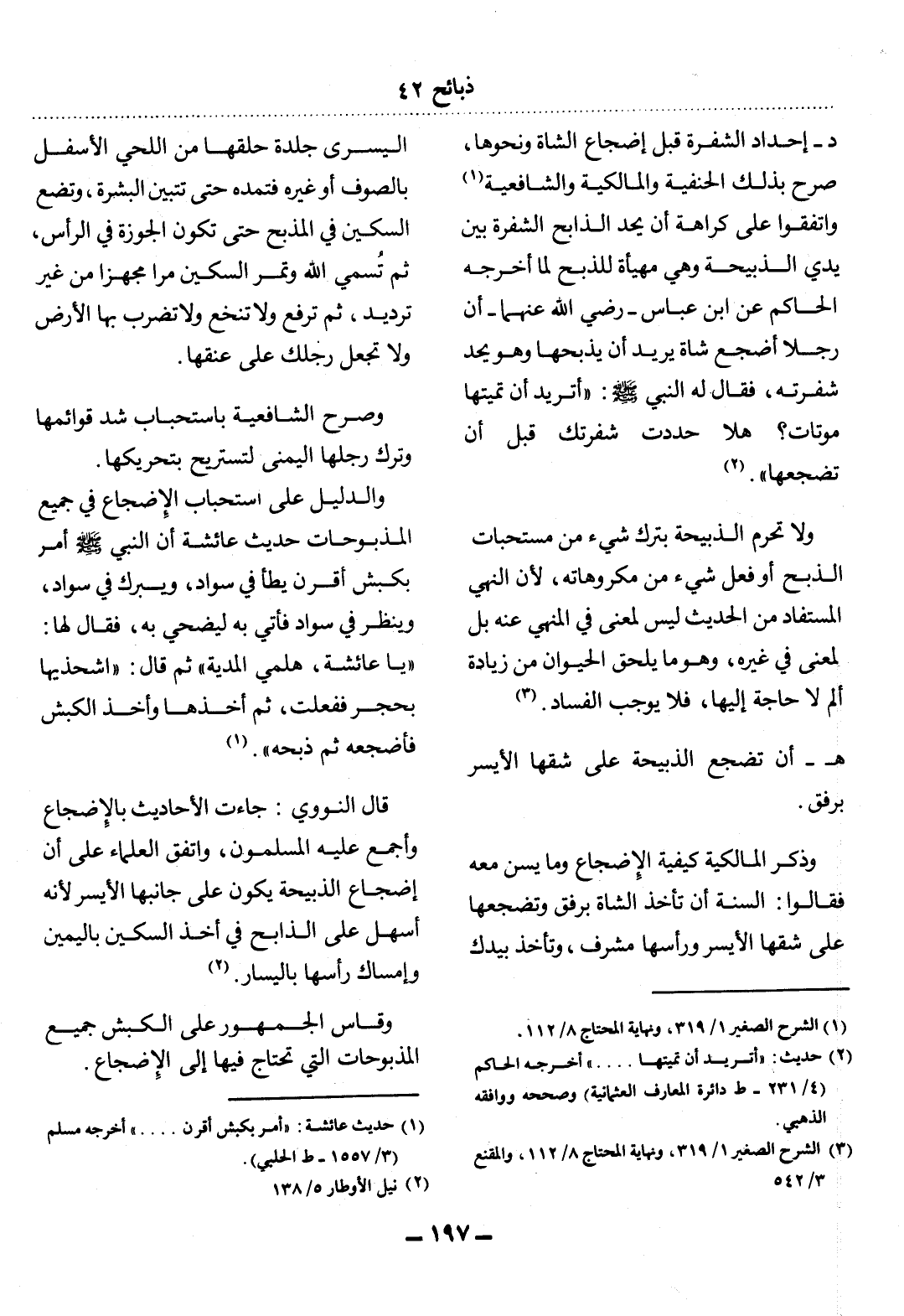 د - إِحْدَادُ الشَّفْرَةِ قَبْل إِضْجَاعِ الشَّاةِ وَنَحْوِهَا، صَرَّحَ بِذَلِكَ الْحَنَفِيَّةُ وَالْمَالِكِيَّةُ وَالشَّافِعِيَّةُ (1) وَاتَّفَقُوا عَلَى كَرَاهَةِ أَنْ يَحُدَّ الذَّابِحُ الشَّفْرَةَ بَيْنَ يَدَيِ الذَّبِيحَةِ، وَهِيَ مُهَيَّأَةٌ لِلذَّبْحِ لِمَا أَخْرَجَهُ الْحَاكِمُ عَنِ ابْنِ عَبَّاسٍ - رَضِيَ اللَّهُ عَنْهُمَا - أَنَّ رَجُلاً أَضْجَعَ شَاةً يُرِيدُ أَنْ يَذْبَحَهَا وَهُوَ يَحُدُّ شَفْرَتَهُ، فَقَال لَهُ النَّبِيُّ صَلَّى اللَّهُ عَلَيْهِ وَسَلَّمَ: أَتُرِيدُ أَنْ تُمِيتَهَا مَوْتَاتٍ؟ هَلاَّ حَدَدْتَ شَفْرَتَكَ قَبْل أَنْ تُضْجِعَهَا. (2)