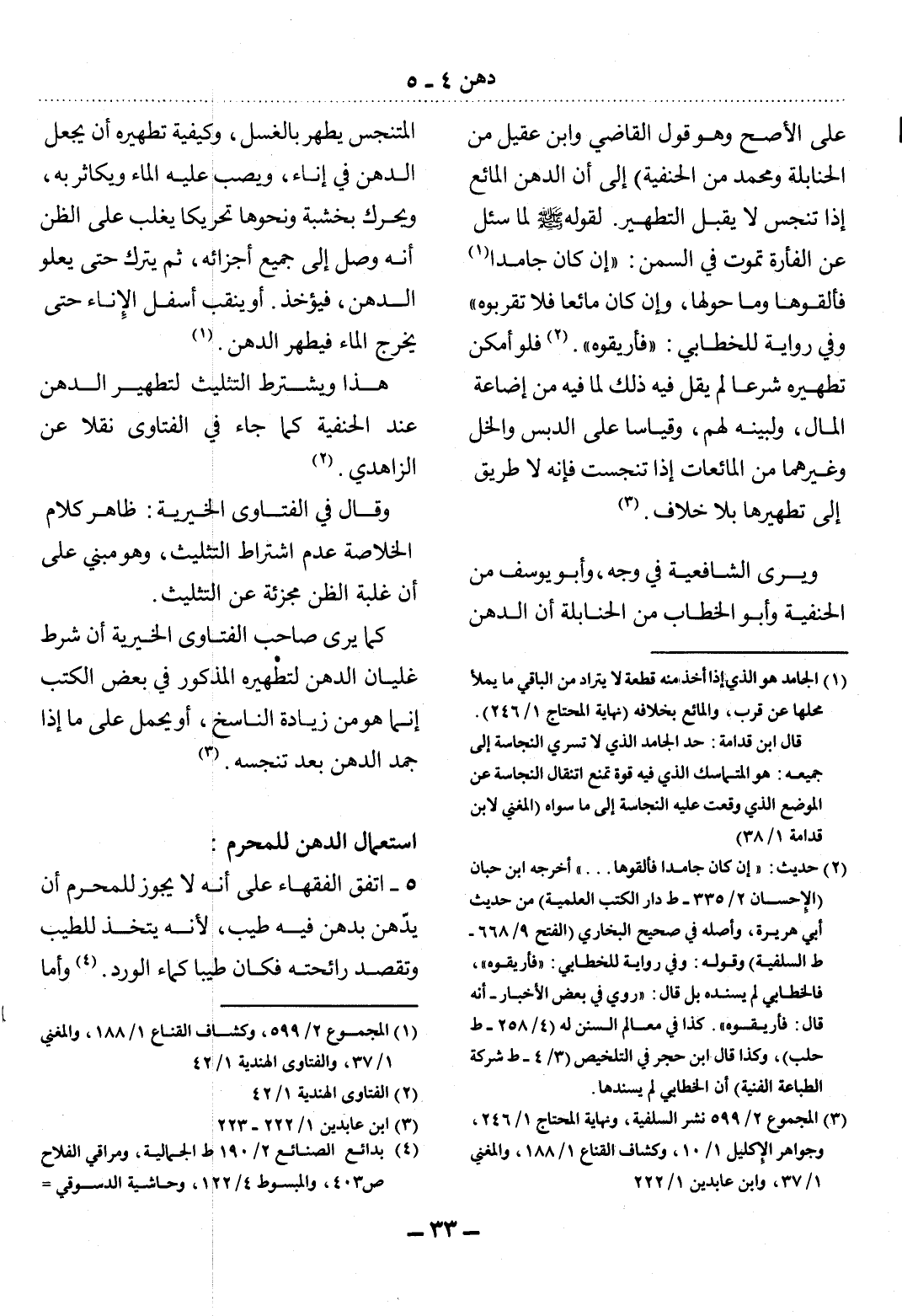 (1) الجامد هو الذي إذا أخذ منه قطعة لا يتراد من الباقي ما يملأ محلها عن قرب، والمائع بخلافه (نهاية المحتاج 1 / 246) . قال ابن قدامة: حد الجامد الذي لا تسري النجاسة إلى جميعه: هو المتماسك الذي فيه قوة تمنع انتقال النجاسة عن الموضع الذي وقعت عليه النجاسة إلى