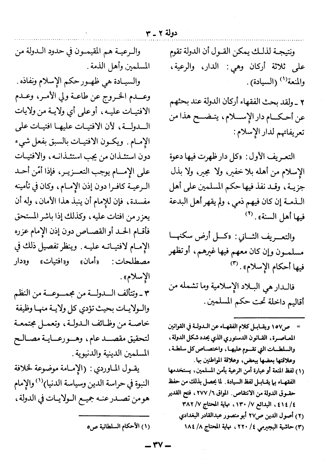 3 - وَتَتَأَلَّفُ الدَّوْلَةُ مِنْ مَجْمُوعَةٍ مِنَ النُّظُمِ وَالْوِلاَيَاتِ بِحَيْثُ تُؤَدِّي كُل وِلاَيَةٍ مِنْهَا وَظِيفَةً خَاصَّةً مِنْ وَظَائِفِ الدَّوْلَةِ، وَتَعْمَل مُجْتَمِعَةً لِتَحْقِيقِ مَقْصِدٍ عَامٍّ، وَهُوَ رِعَايَةُ مَصَالِحِ الْمُسْلِمِينَ الدِّينِيَّةِ وَالدُّنْيَوِيَّةِ.