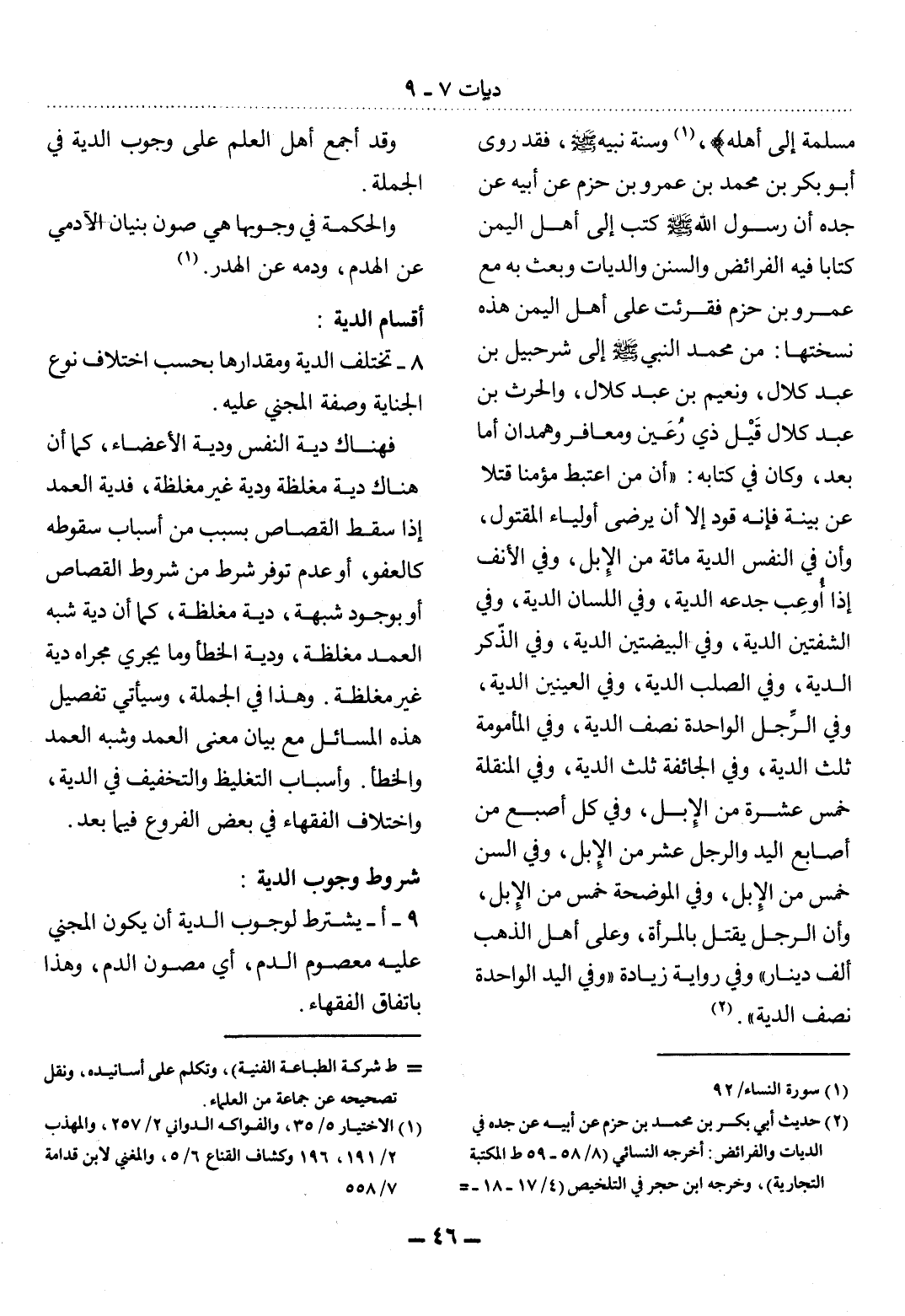 مُسَلَّمَةٌ إِلَى أَهْلِهِ (1) } ، وَسُنَّةُ نَبِيِّهِ صَلَّى اللَّهُ عَلَيْهِ وَسَلَّمَ فَقَدْ رَوَى أَبُو بَكْرِ بْنُ مُحَمَّدِ بْنِ عَمْرِو بْنِ حَزْمٍ عَنْ أَبِيهِ عَنْ جَدِّهِ أَنَّ رَسُول اللَّهِ صَلَّى اللَّهُ عَلَيْهِ وَسَلَّمَ كَتَبَ إِلَى أَهْل الْيَمَنِ كِتَابًا فِيهِ الْفَرَائِضُ وَالسُّنَنُ وَالدِّيَاتُ وَبَعَثَ بِهِ مَعَ عَمْرِو بْنِ حَزْمٍ فَقُرِئَتْ عَلَى أَهْل الْيَمَنِ هَذِهِ نُسْخَتُهَا: مِنْ مُحَمَّدٍ النَّبِيِّ صَلَّى اللَّهُ عَلَيْهِ وَسَلَّمَ إِلَى شُرَحْبِيل بْنِ عَبْدِ كُلاَلٍ، وَنُعَيْمِ بْنِ عَبْدِ كُلاَلٍ، وَالْحَارِثِ بْنِ عَبْدِ كُلاَلٍ قَيْل ذِي رُعَيْنٍ وَمَعَافِرَ وَهَمْدَانَ أَمَّا بَعْدُ، وَكَانَ فِي كِتَابِهِ: إِنَّ مَنِ اعْتَبَطَ مُؤْمِنًا قَتْلاً عَنْ بَيِّنَةٍ فَإِنَّهُ قَوَدٌ إِلاَّ أَنْ يَرْضَى أَوْلِيَاءُ الْمَقْتُول، وَأَنَّ فِي النَّفْسِ الدِّيَةَ مِائَةً مِنَ الإِْبِل، وَفِي الأَْنْفِ إِذَا أُوعِبَ جَدْعُهُ الدِّيَةُ، وَفِي اللِّسَانِ الدِّيَةُ، وَفِي الشَّفَتَيْنِ الدِّيَةُ، وَفِي الْبَيْضَتَيْنِ الدِّيَةُ، وَفِي الذَّكَرِ الدِّيَةُ، وَفِي الصُّلْبِ الدِّيَةُ، وَفِي الْعَيْنَيْنِ الدِّيَةُ، وَفِي الرِّجْل الْوَاحِدَةِ نِصْفُ الدِّيَةِ، وَفِي الْمَأْمُومَةِ ثُلُثُ الدِّيَةِ، وَفِي الْجَائِفَةِ ثُلُثُ الدِّيَةِ، وَفِي الْمُنَقِّلَةِ خَمْسَ عَشْرَةَ مِنَ الإِْبِل، وَفِي كُل أُصْبُعٍ مِنْ أَصَابِعِ الْيَدِ وَالرِّجْل عَشْرٌ مِنَ الإِْبِل، وَفِي السِّنِّ خَمْسٌ مِنَ الإِْبِل، وَفِي الْمُوضِحَةِ خَمْسٌ مِنَ الإِْبِل، وَأَنَّ الرَّجُل يُقْتَل بِالْمَرْأَةِ، وَعَلَى أَهْل الذَّهَبِ أَلْفُ دِينَارٍ وَفِي رِوَايَةٍ زِيَادَةُ وَفِي الْيَدِ الْوَاحِدَةِ نِصْفُ الدِّيَةِ (2) .