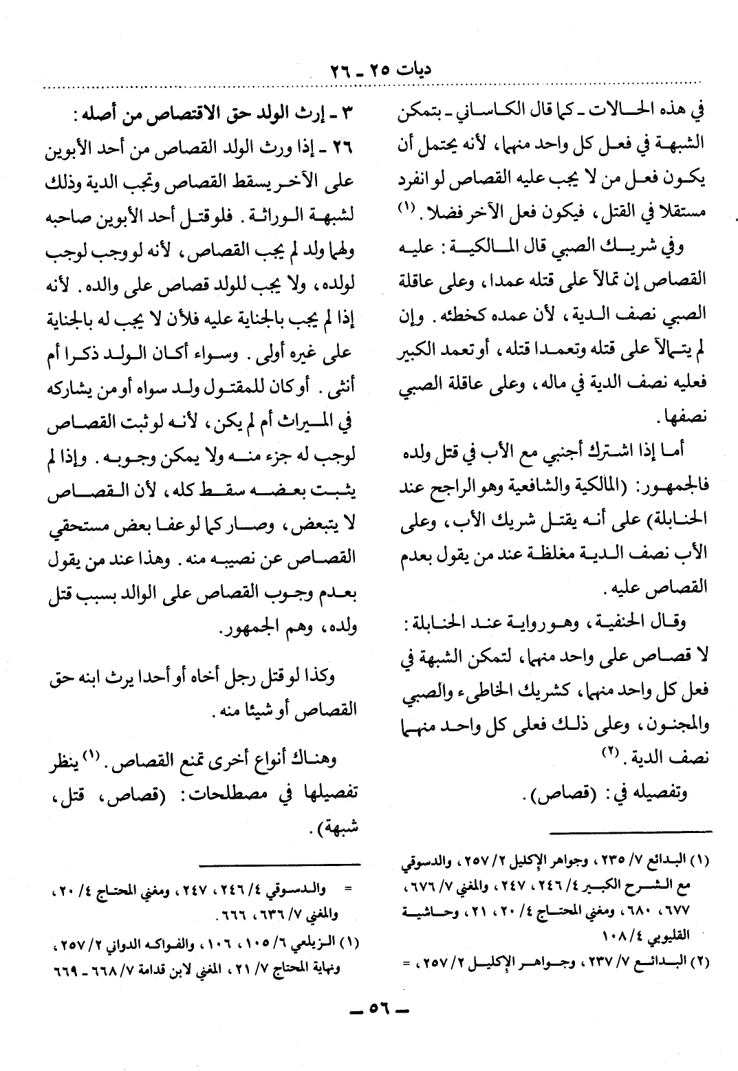 26 - إِذَا وَرِثَ الْوَلَدُ الْقِصَاصَ مِنْ أَحَدِ الأَْبَوَيْنِ عَلَى الآْخَرِ يَسْقُطُ الْقِصَاصُ وَتَجِبُ الدِّيَةُ وَذَلِكَ لِشُبْهَةِ الْوِرَاثَةِ. فَلَوْ قَتَل أَحَدُ الأَْبَوَيْنِ صَاحِبَهُ وَلَهُمَا وَلَدٌ لَمْ يَجِبِ الْقِصَاصُ؛ لأَِنَّهُ لَوْ وَجَبَ لَوَجَبَ لِوَلَدِهِ، وَلاَ يَجِبُ لِلْوَلَدِ قِصَاصٌ عَلَى وَالِدِهِ.؛ لأَِنَّهُ إِذَا لَمْ يَجِبْ بِالْجِنَايَةِ عَلَيْهِ فَلأََنْ لاَ يَجِبَ لَهُ بِالْجِنَايَةِ عَلَى غَيْرِهِ أَوْلَى. وَسَوَاءٌ أَكَانَ الْوَلَدُ ذَكَرًا أَمْ أُنْثَى. أَوْ كَانَ لِلْمَقْتُول وَلَدٌ سِوَاهُ أَوْ مَنْ يُشَارِكُهُ فِي الْمِيرَاثِ أَمْ لَمْ يَكُنْ؛ لأَِنَّهُ لَوْ ثَبَتَ الْقِصَاصُ لَوَجَبَ لَهُ جُزْءٌ مِنْهُ وَلاَ يُمْكِنُ وُجُوبُهُ. وَإِذَا لَمْ يَثْبُتْ بَعْضُهُ سَقَطَ كُلُّهُ؛ لأَِنَّ الْقِصَاصَ لاَ يَتَبَعَّضُ، وَصَارَ كَمَا لَوْ عَفَا بَعْضُ مُسْتَحَقِّي الْقِصَاصِ عَنْ نَصِيبِهِ مِنْهُ، وَهَذَا عِنْدَ مَنْ يَقُول بِعَدَمِ وُجُوبِ الْقِصَاصِ عَلَى الْوَالِدِ بِسَبَبِ قَتْل وَلَدِهِ، وَهُمُ الْجُمْهُورُ.