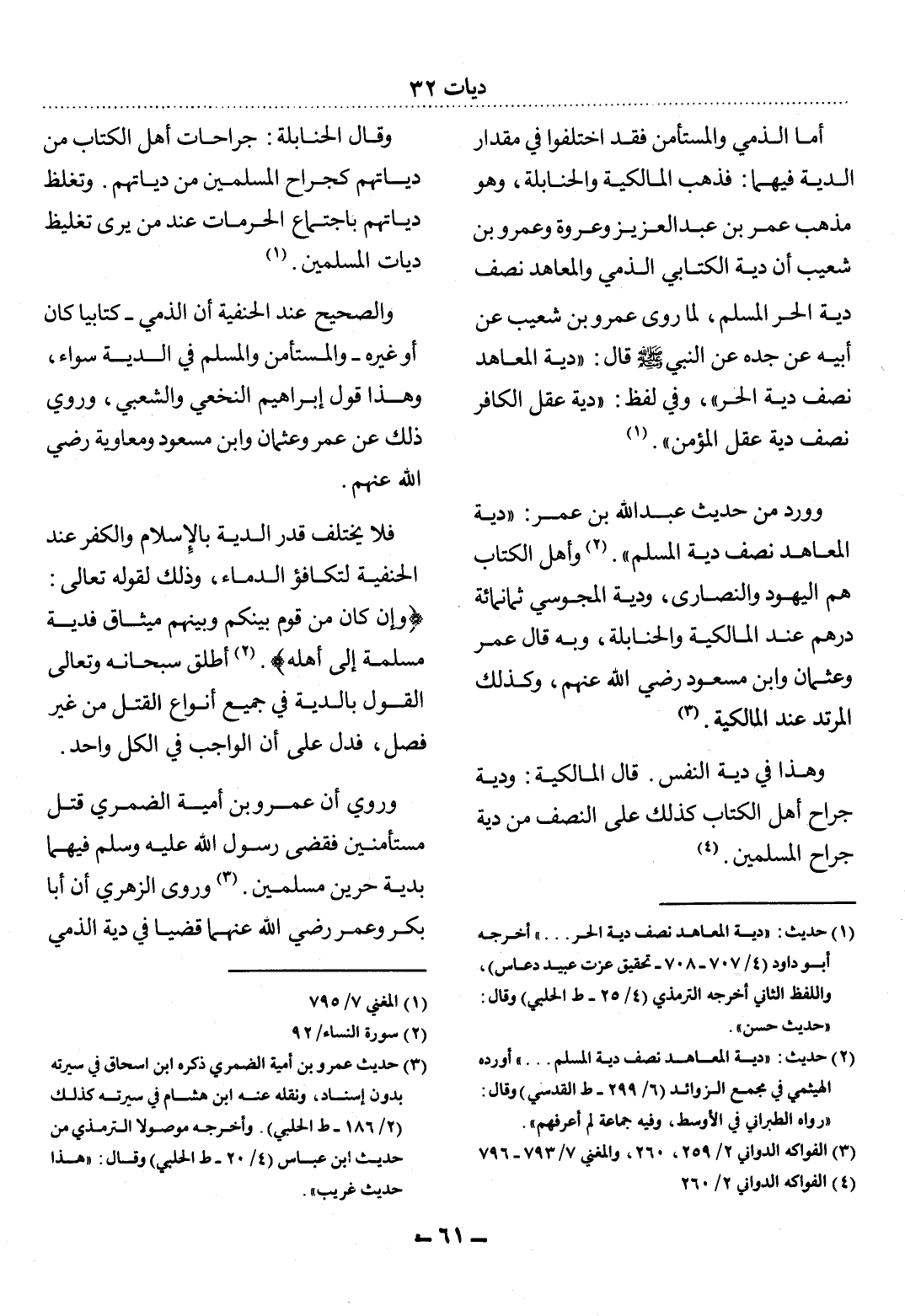 (1) حديث: " دية المعاهد نصف دية الحر. . . " أخرجه أبو داود (4 / 707 - 708 - تحقيق عزت عبيد دعاس) ، واللفظ الثاني أخرجه الترمذي (4 / 25 - ط الحلبي) ، وقال: " حديث حسن ".