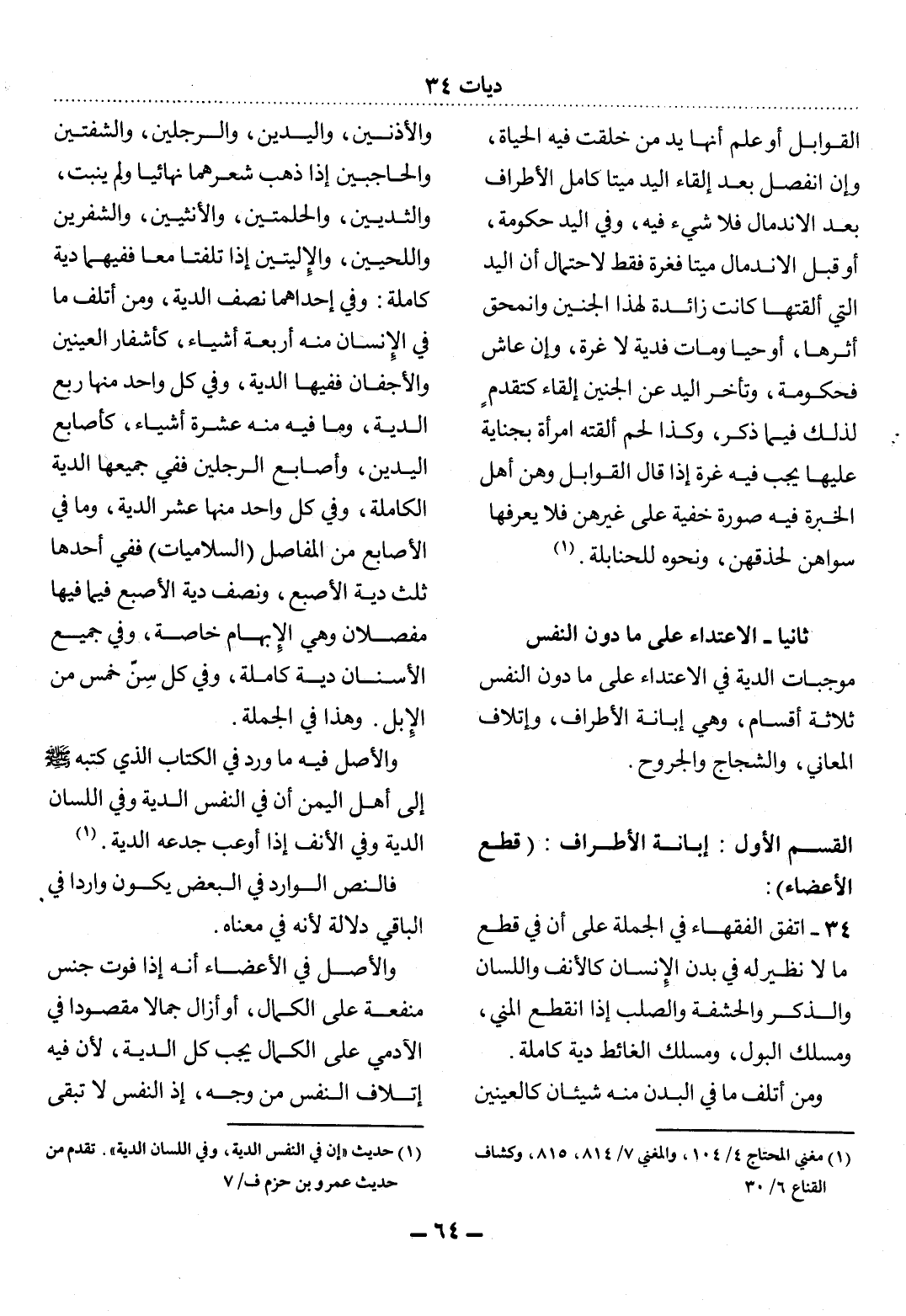 34 - اتَّفَقَ الْفُقَهَاءُ فِي الْجُمْلَةِ عَلَى أَنَّ فِي قَطْعِ مَا لاَ نَظِيرَ لَهُ فِي بَدَنِ الإِْنْسَانِ كَالأَْنْفِ وَاللِّسَانِ وَالذَّكَرِ وَالْحَشَفَةِ وَالصُّلْبِ إِذَا انْقَطَعَ الْمَنِيُّ، وَمَسْلَكِ الْبَوْل، وَمَسْلَكِ الْغَائِطِ دِيَةً كَامِلَةً.