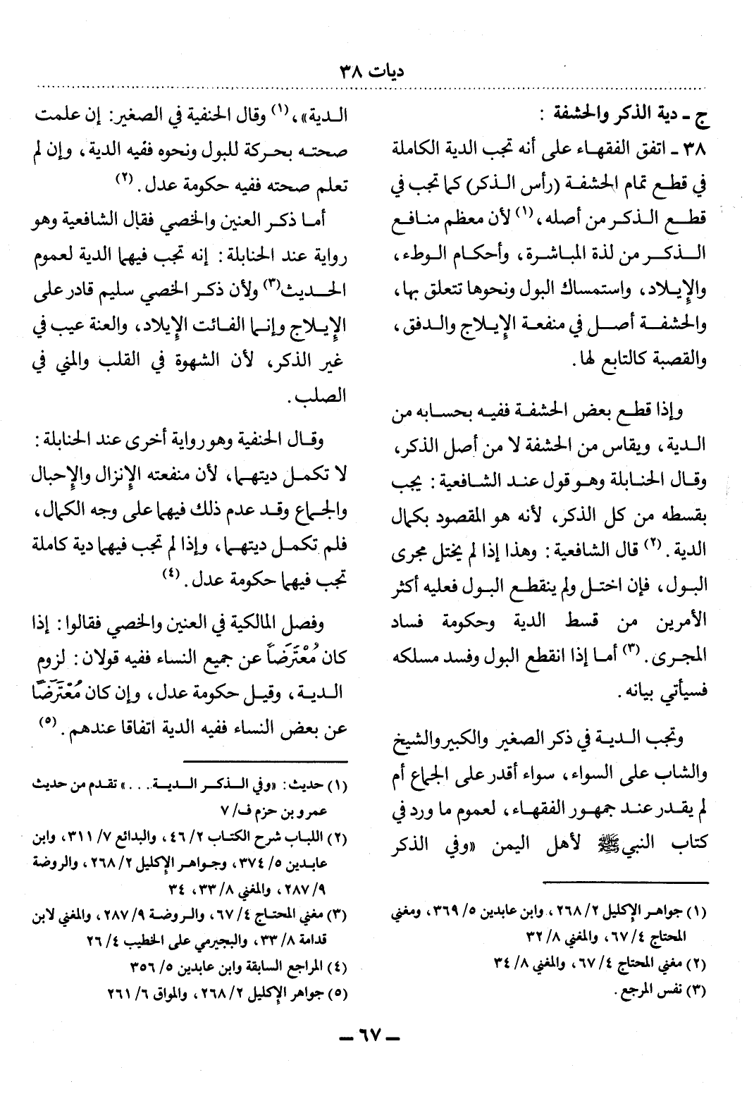 38 - اتَّفَقَ الْفُقَهَاءُ عَلَى أَنَّهُ تَجِبُ الدِّيَةُ الْكَامِلَةُ فِي قَطْعِ تَمَامِ الْحَشَفَةِ (رَأْسِ الذَّكَرِ) كَمَا تَجِبُ فِي قَطْعِ الذَّكَرِ مِنْ أَصْلِهِ (1) ؛ لأَِنَّ مُعْظَمَ مَنَافِعِ الذَّكَرِ مِنْ لَذَّةِ الْمُبَاشَرَةِ، وَأَحْكَامِ الْوَطْءِ، وَالإِْيلاَدِ، وَاسْتِمْسَاكِ الْبَوْل وَنَحْوِهَا تَتَعَلَّقُ بِهَا، وَالْحَشَفَةُ أَصْلٌ فِي مَنْفَعَةِ الإِْيلاَجِ وَالدَّفْقِ، وَالْقَصَبَةُ كَالتَّابِعِ لَهَا.