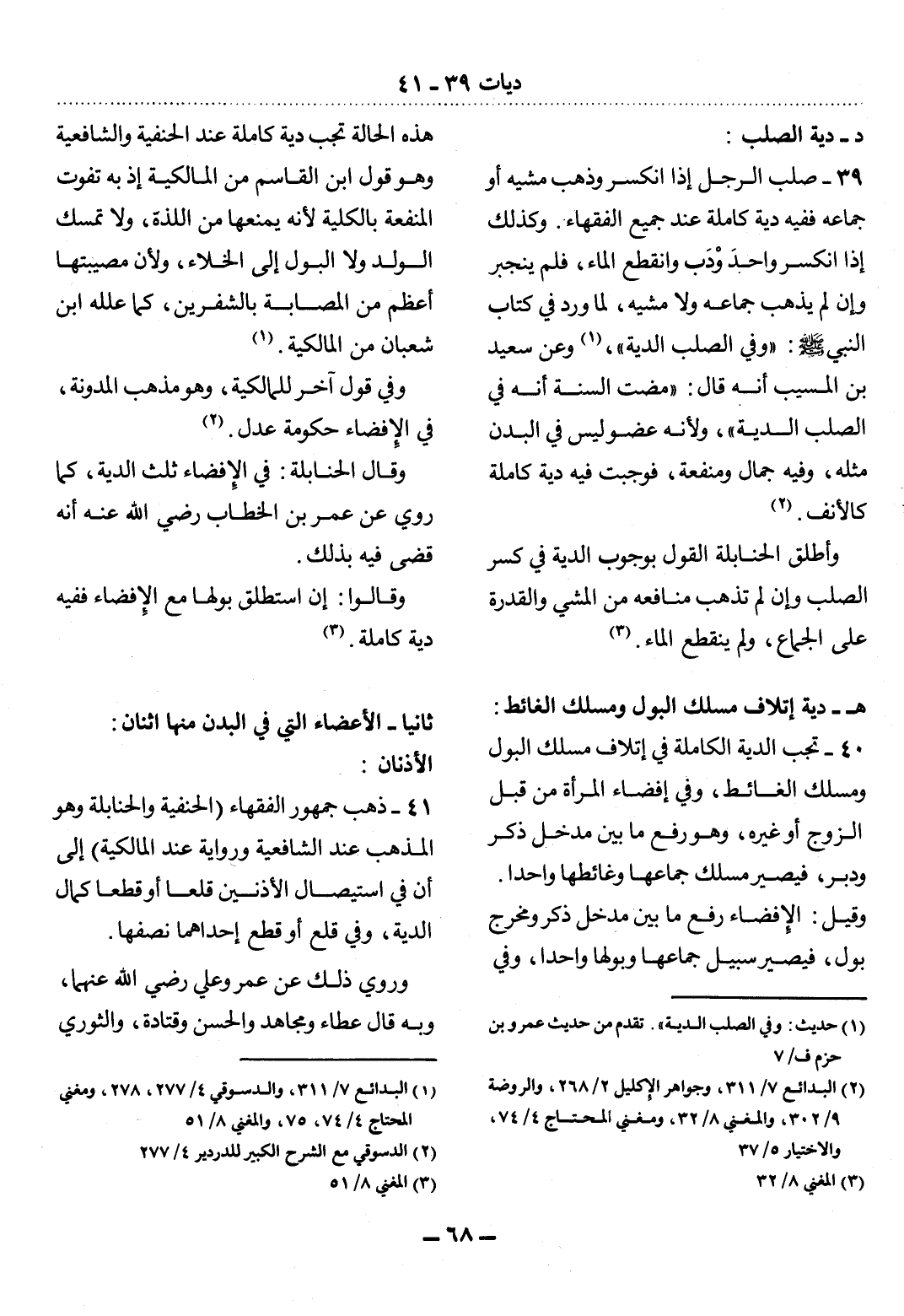 39 - صُلْبُ الرَّجُل إِذَا انْكَسَرَ وَذَهَبَ مَشْيُهُ أَوْ جِمَاعُهُ فَفِيهِ دِيَةٌ كَامِلَةٌ عِنْدَ جَمِيعِ الْفُقَهَاءِ. وَكَذَلِكَ إِذَا انْكَسَرَ وَاحْدَوْدَبَ وَانْقَطَعَ الْمَاءُ، فَلَمْ يَنْجَبِرْ وَإِنْ لَمْ يَذْهَبْ جِمَاعُهُ وَلاَ مَشْيُهُ؛ لِمَا وَرَدَ فِي كِتَابِ النَّبِيِّ صَلَّى اللَّهُ عَلَيْهِ وَسَلَّمَ: وَفِي الصُّلْبِ الدِّيَةُ (1) ، وَعَنْ سَعِيدِ بْنِ الْمُسَيِّبِ أَنَّهُ قَال: " مَضَتِ السُّنَّةُ أَنَّهُ فِي الصُّلْبِ الدِّيَةُ "؛ وَلأَِنَّهُ عُضْوٌ لَيْسَ فِي الْبَدَنِ مِثْلُهُ، وَفِيهِ جَمَالٌ وَمَنْفَعَةٌ، فَوَجَبَتْ فِيهِ دِيَةٌ كَامِلَةٌ كَالأَْنْفِ (2) .