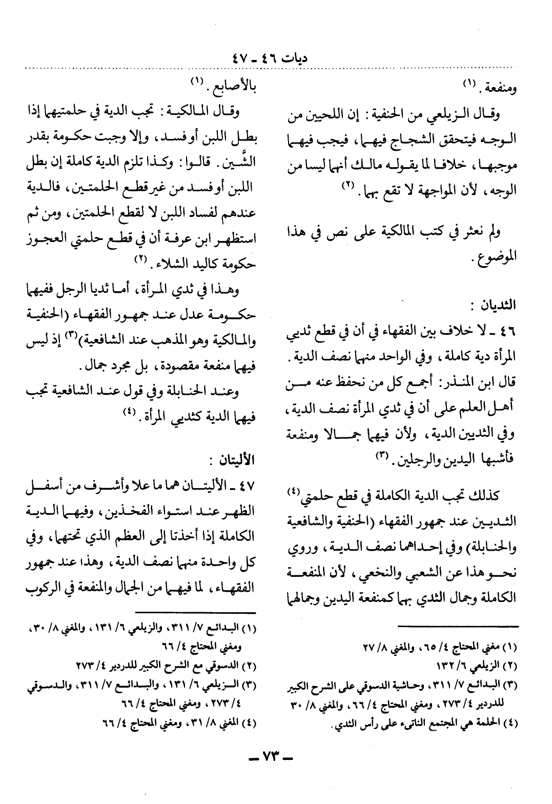 46 - لاَ خِلاَفَ بَيْنَ الْفُقَهَاءِ فِي أَنَّ فِي قَطْعِ ثَدْيَيِ الْمَرْأَةِ دِيَةً كَامِلَةً، وَفِي الْوَاحِدِ مِنْهُمَا نِصْفَ الدِّيَةِ.