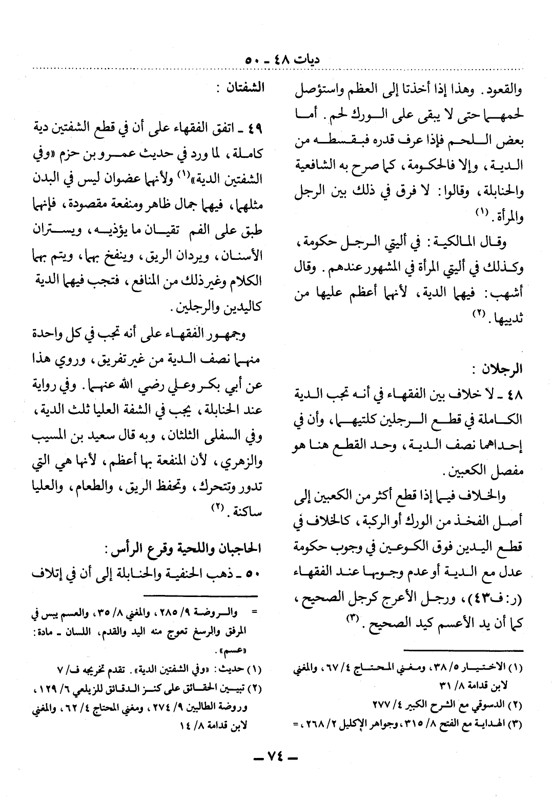 48 - لاَ خِلاَفَ بَيْنَ الْفُقَهَاءِ فِي أَنَّهُ تَجِبُ الدِّيَةُ الْكَامِلَةُ فِي قَطْعِ الرِّجْلَيْنِ كِلْتَيْهِمَا، وَأَنَّ فِي إِحْدَاهُمَا نِصْفَ الدِّيَةِ وَحَدُّ الْقَطْعِ هُنَا هُوَ مَفْصِل الْكَعْبَيْنِ.