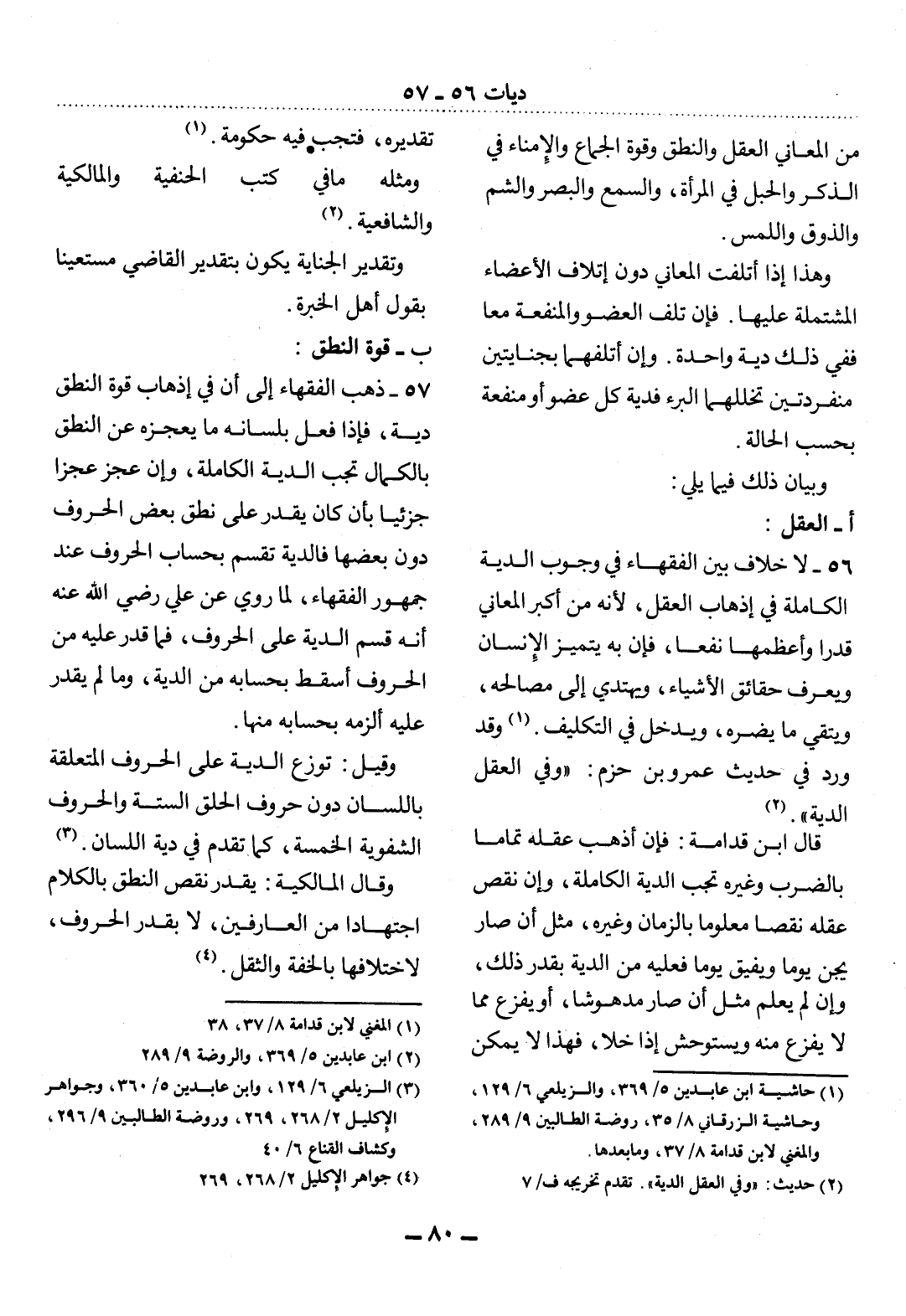 56 - لاَ خِلاَفَ بَيْنَ الْفُقَهَاءِ فِي وُجُوبِ الدِّيَةِ الْكَامِلَةِ فِي إِذْهَابِ الْعَقْل؛ لأَِنَّهُ مِنْ أَكْبَرِ الْمَعَانِي قَدْرًا وَأَعْظَمِهَا نَفْعًا، فَإِنَّ بِهِ يَتَمَيَّزُ الإِْنْسَانُ وَيَعْرِفُ حَقَائِقَ الأَْشْيَاءِ، وَيَهْتَدِي إِلَى مَصَالِحِهِ، وَيَتَّقِي مَا يَضُرُّهُ، وَيَدْخُل فِي التَّكْلِيفِ (1) . وَقَدْ وَرَدَ فِي حَدِيثِ عَمْرِو بْنِ حَزْمٍ: وَفِي الْعَقْل الدِّيَةُ (2) .