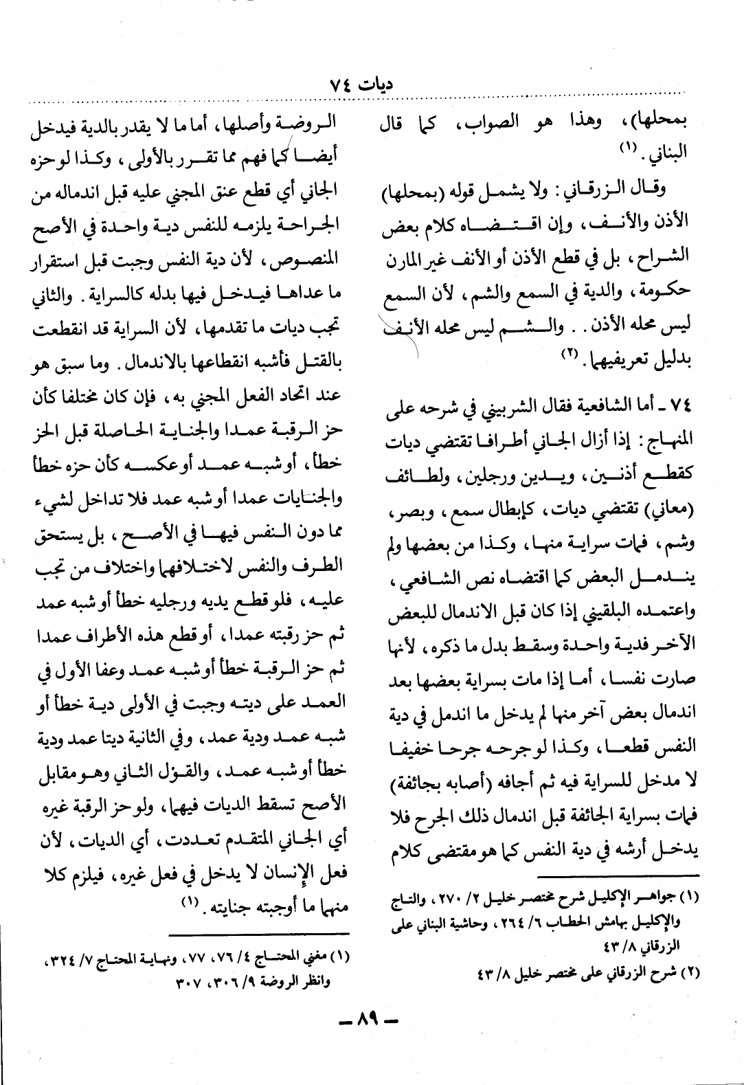 (1) جواهر الإكليل شرح مختصر خليل 2 / 270، والتاج والإكليل بهامش الحطاب 6 / 264، وحاشية البناني على الزرقاني 8 / 43.
