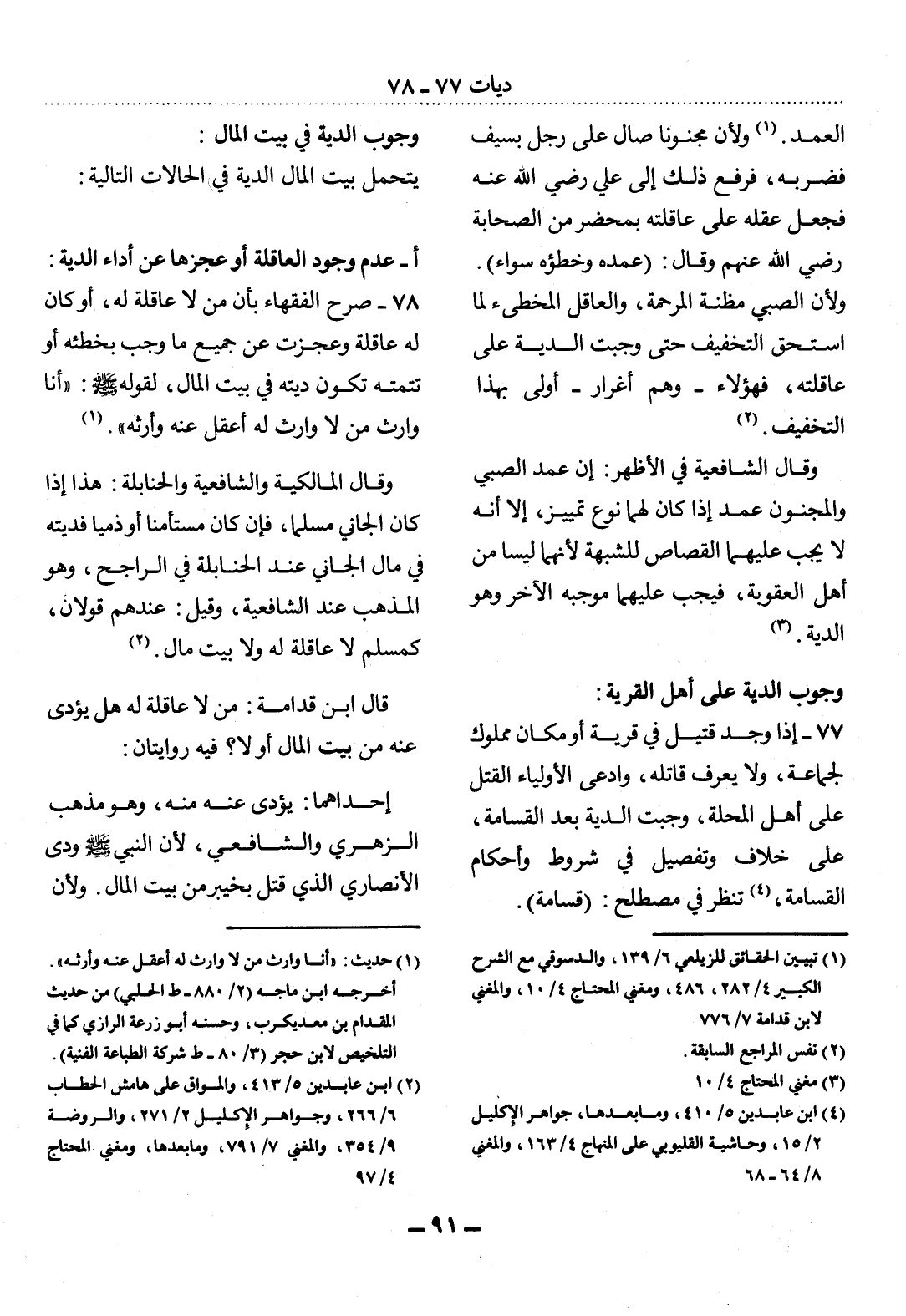77 - إِذَا وُجِدَ قَتِيلٌ فِي قَرْيَةٍ أَوْ مَكَانٍ مَمْلُوكٍ لِجَمَاعَةٍ، وَلاَ يُعْرَفُ قَاتِلُهُ، وَادَّعَى الأَْوْلِيَاءُ الْقَتْل عَلَى أَهْل الْمَحَلَّةِ، وَجَبَتِ الدِّيَةُ بَعْدَ الْقَسَامَةِ (4) ، عَلَى خِلاَفٍ وَتَفْصِيلٍ فِي شُرُوطِ وَأَحْكَامِ الْقَسَامَةِ، تُنْظَرُ فِي مُصْطَلَحِ: (قَسَامَة) .