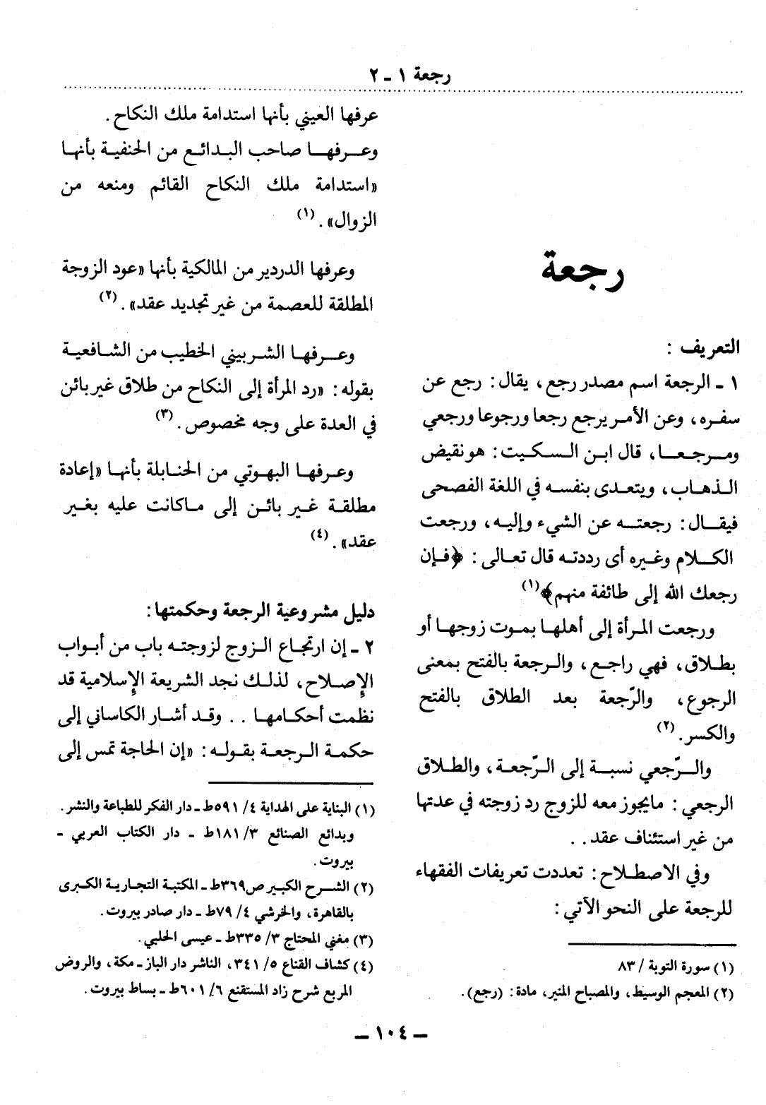1 - الرَّجْعَةُ اسْمُ مَصْدَرِ رَجَعَ، يُقَال: رَجَعَ عَنْ سَفَرِهِ، وَعَنِ الأَْمْرِ يَرْجِعُ رَجْعًا وَرُجُوعًا وَرُجْعَى وَمَرْجِعًا، قَال ابْنُ السِّكِّيتِ: هُوَ نَقِيضُ الذَّهَابِ، وَيَتَعَدَّى بِنَفْسِهِ فِي اللُّغَةِ الْفُصْحَى فَيُقَال: رَجَعْتُهُ عَنِ الشَّيْءِ وَإِلَيْهِ، وَرَجَعْتُ الْكَلاَمَ وَغَيْرَهُ أَيْ رَدَدْتُهُ قَال تَعَالَى: {فَإِنْ رَجَعَكَ اللَّهُ إِلَى طَائِفَةٍ مِنْهُمْ} (1)