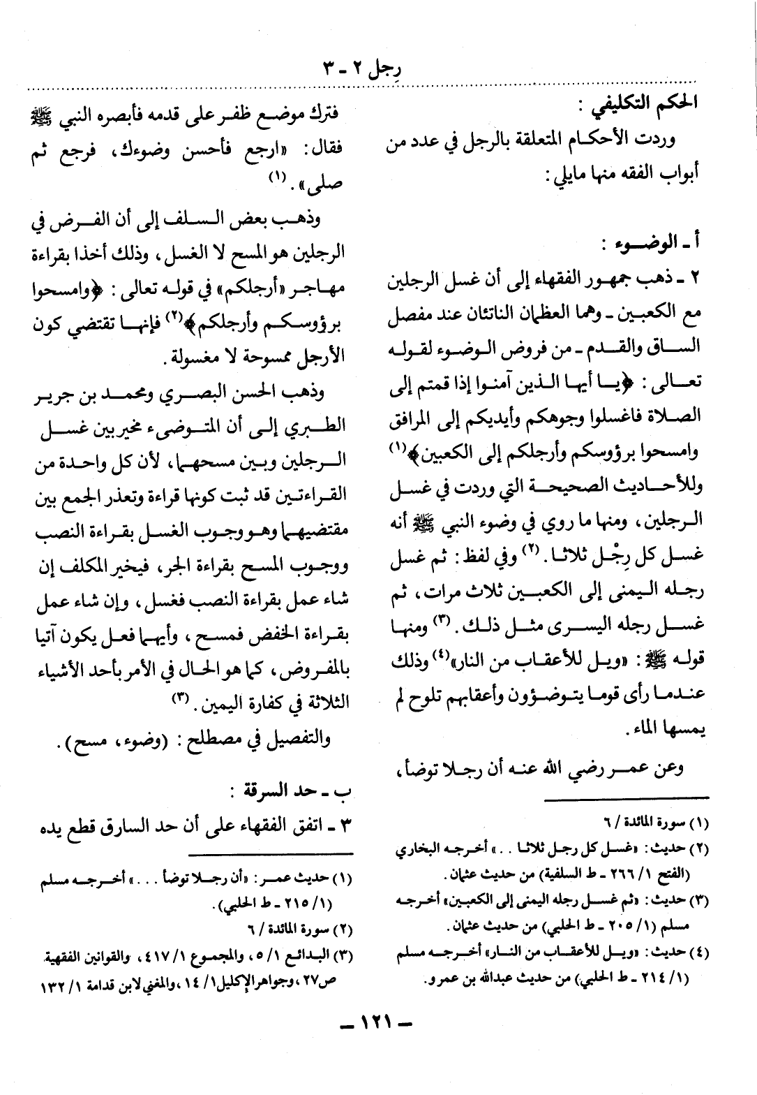 2 - ذَهَبَ جُمْهُورُ الْفُقَهَاءِ إِلَى أَنَّ غَسْل الرِّجْلَيْنِ مَعَ الْكَعْبَيْنِ - وَهُمَا الْعَظْمَانِ النَّاتِئَانِ عِنْدَ مَفْصِل السَّاقِ وَالْقَدَمِ - مِنْ فُرُوضِ الْوُضُوءِ لِقَوْلِهِ تَعَالَى: {يَا أَيُّهَا الَّذِينَ آمَنُوا إِذَا قُمْتُمْ إِلَى الصَّلاَةِ فَاغْسِلُوا وُجُوهَكُمْ وَأَيْدِيَكُمْ إِلَى الْمَرَافِقِ وَامْسَحُوا بِرُءُوسِكُمْ وَأَرْجُلَكُمْ إِلَى الْكَعْبَيْنِ. . .} (1) وَلِلأَْحَادِيثِ الصَّحِيحَةِ الَّتِي وَرَدَتْ فِي غَسْل الرِّجْلَيْنِ، وَمِنْهَا مَا رُوِيَ فِي وُضُوءِ النَّبِيِّ صَلَّى اللَّهُ عَلَيْهِ وَسَلَّمَ أَنَّهُ غَسَل كُل رِجْلٍ ثَلاَثًا (2) . وَفِي لَفْظٍ: ثُمَّ غَسَل رِجْلَهُ الْيُمْنَى إِلَى الْكَعْبَيْنِ ثَلاَثَ مَرَّاتٍ، ثُمَّ غَسَل رِجْلَهُ الْيُسْرَى مِثْل ذَلِكَ (3) . وَمِنْهَا قَوْلُهُ صَلَّى اللَّهُ عَلَيْهِ وَسَلَّمَ: وَيْلٌ لِلأَْعْقَابِ مِنَ النَّارِ (4) وَذَلِكَ عِنْدَمَا رَأَى قَوْمًا يَتَوَضَّئُونَ وَأَعْقَابُهُمْ تَلُوحُ لَمْ يَمَسَّهَا الْمَاءُ.