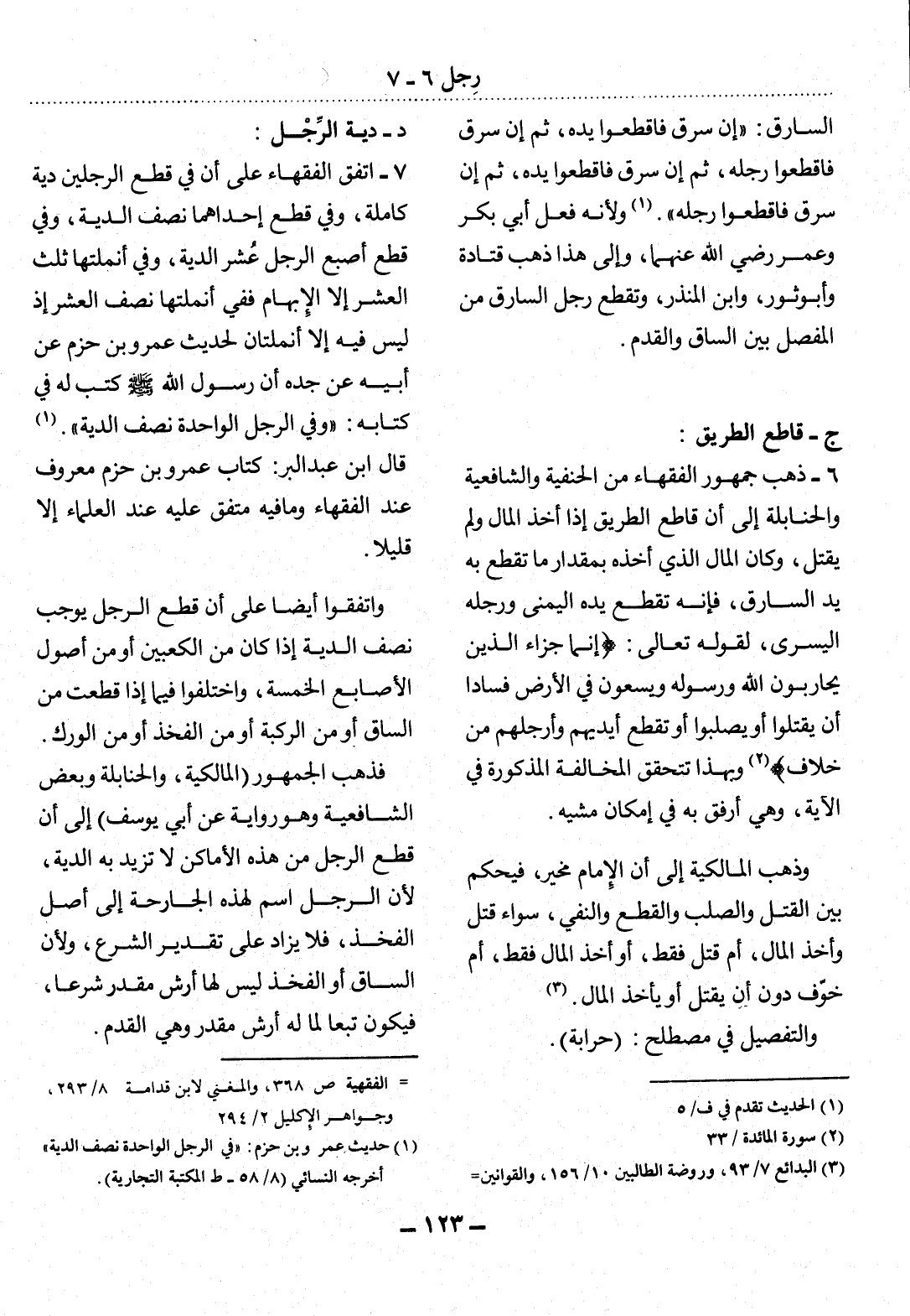 السَّارِقِ: إِنْ سَرَقَ فَاقْطَعُوا يَدَهُ، ثُمَّ إِنْ سَرَقَ فَاقْطَعُوا رِجْلَهُ، ثُمَّ إِنْ سَرَقَ فَاقْطَعُوا يَدَهُ، ثُمَّ إِنْ سَرَقَ فَاقْطَعُوا رِجْلَهُ (1) . وَلأَِنَّهُ فِعْل أَبِي بَكْرٍ وَعُمَرَ رَضِيَ اللَّهُ عَنْهُمَا، وَإِلَى هَذَا ذَهَبَ قَتَادَةُ وَأَبُو ثَوْرٍ، وَابْنُ الْمُنْذِرِ، وَتُقْطَعُ رِجْل السَّارِقِ مِنَ الْمَفْصِل بَيْنَ السَّاقِ وَالْقَدَمِ.