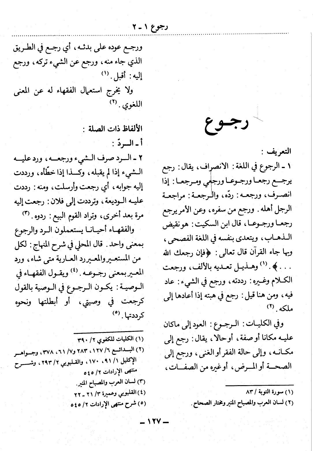 وَرَجَعَ عَوْدُهُ عَلَى بَدْئِهِ، أَيْ رَجَعَ فِي الطَّرِيقِ الَّذِي جَاءَ مِنْهُ، وَرَجَعَ عَنِ الشَّيْءِ تَرَكَهُ، وَرَجَعَ إِلَيْهِ: أَقْبَل (1) .