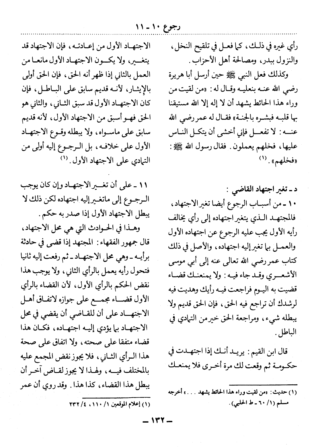 10 - مِنْ أَسْبَابِ الرُّجُوعِ أَيْضًا تَغَيُّرُ الاِجْتِهَادِ، فَالْمُجْتَهِدُ الَّذِي يَتَغَيَّرُ اجْتِهَادُهُ إِلَى رَأْيٍ يُخَالِفُ رَأْيَهُ الأَْوَّل يَجِبُ عَلَيْهِ الرُّجُوعُ عَنِ اجْتِهَادِهِ الأَْوَّل وَالْعَمَل بِمَا تَغَيَّرَ إِلَيْهِ اجْتِهَادُهُ، وَالأَْصْل فِي ذَلِكَ كِتَابُ عُمَرَ رَضِيَ اللَّهُ عَنْهُ إِلَى أَبِي مُوسَى الأَْشْعَرِيِّ وَقَدْ جَاءَ فِيهِ: وَلاَ يَمْنَعَنَّكَ قَضَاءٌ قَضَيْتَ بِهِ الْيَوْمَ فَرَاجَعْتَ فِيهِ رَأْيَكَ وَهُدِيتَ فِيهِ لِرُشْدِكَ أَنْ تُرَاجِعَ فِيهِ الْحَقَّ، فَإِنَّ الْحَقَّ قَدِيمٌ وَلاَ يُبْطِلُهُ شَيْءٌ، وَمُرَاجَعَةُ الْحَقِّ خَيْرٌ مِنَ التَّمَادِي فِي الْبَاطِل.