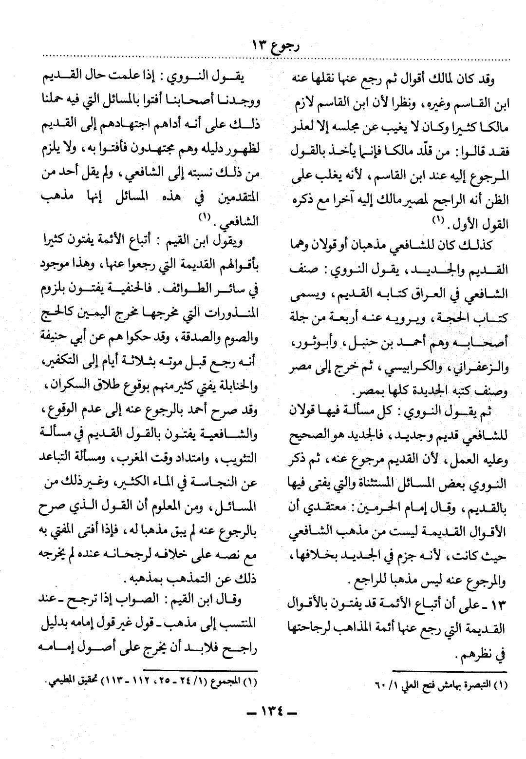 ثُمَّ يَقُول النَّوَوِيُّ: كُل مَسْأَلَةٍ فِيهَا قَوْلاَنِ لِلشَّافِعِيِّ قَدِيمٌ وَجَدِيدٌ، فَالْجَدِيدُ هُوَ الصَّحِيحُ وَعَلَيْهِ الْعَمَل؛ لأَِنَّ الْقَدِيمَ مَرْجُوعٌ عَنْهُ، ثُمَّ ذَكَرَ النَّوَوِيُّ بَعْضَ الْمَسَائِل الْمُسْتَثْنَاةِ وَالَّتِي يُفْتَى فِيهَا بِالْقَدِيمِ. وَقَال إِمَامُ الْحَرَمَيْنِ: مُعْتَقَدِي أَنَّ الأَْقْوَال الْقَدِيمَةَ لَيْسَتْ مِنْ مَذْهَبِ الشَّافِعِيِّ حَيْثُ كَانَتْ؛ لأَِنَّهُ جَزَمَ فِي الْجَدِيدِ بِخِلاَفِهَا، وَالْمَرْجُوعُ عَنْهُ لَيْسَ مَذْهَبًا لِلرَّاجِعِ.