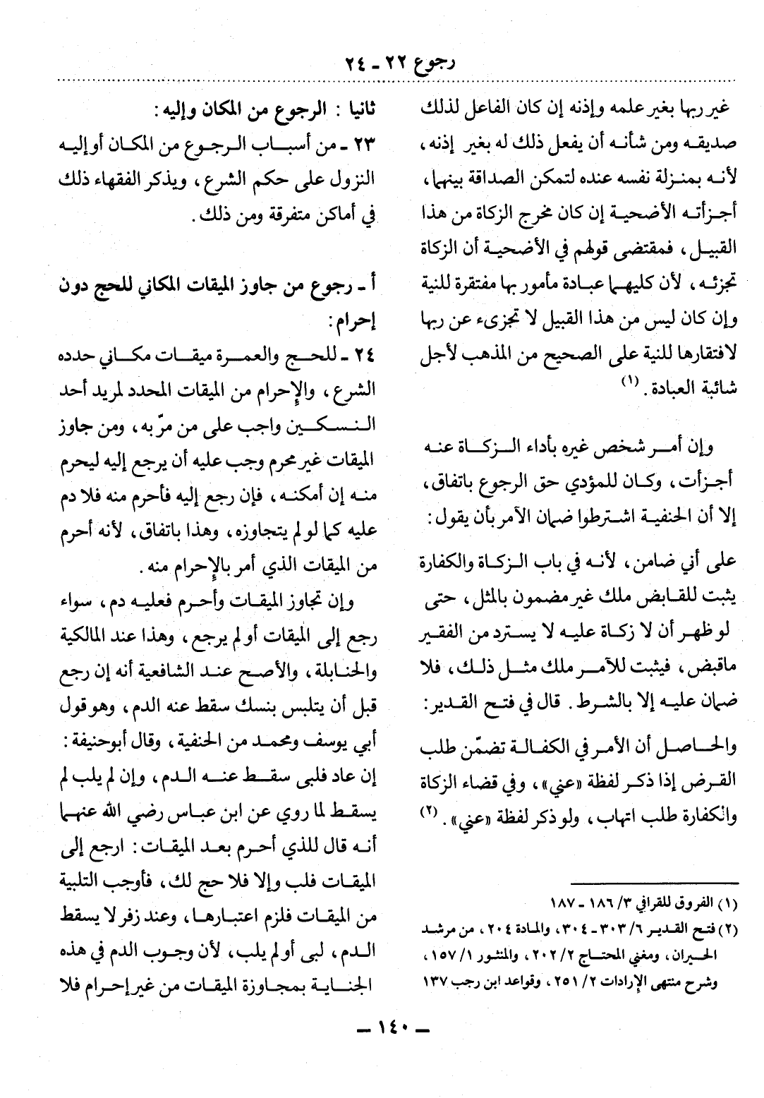 23 - مِنْ أَسْبَابِ الرُّجُوعِ مِنَ الْمَكَانِ أَوْ إِلَيْهِ النُّزُول عَلَى حُكْمِ الشَّرْعِ، وَيَذْكُرُ الْفُقَهَاءُ ذَلِكَ فِي أَمَاكِنَ مُتَفَرِّقَةٍ وَمِنْ ذَلِكَ.