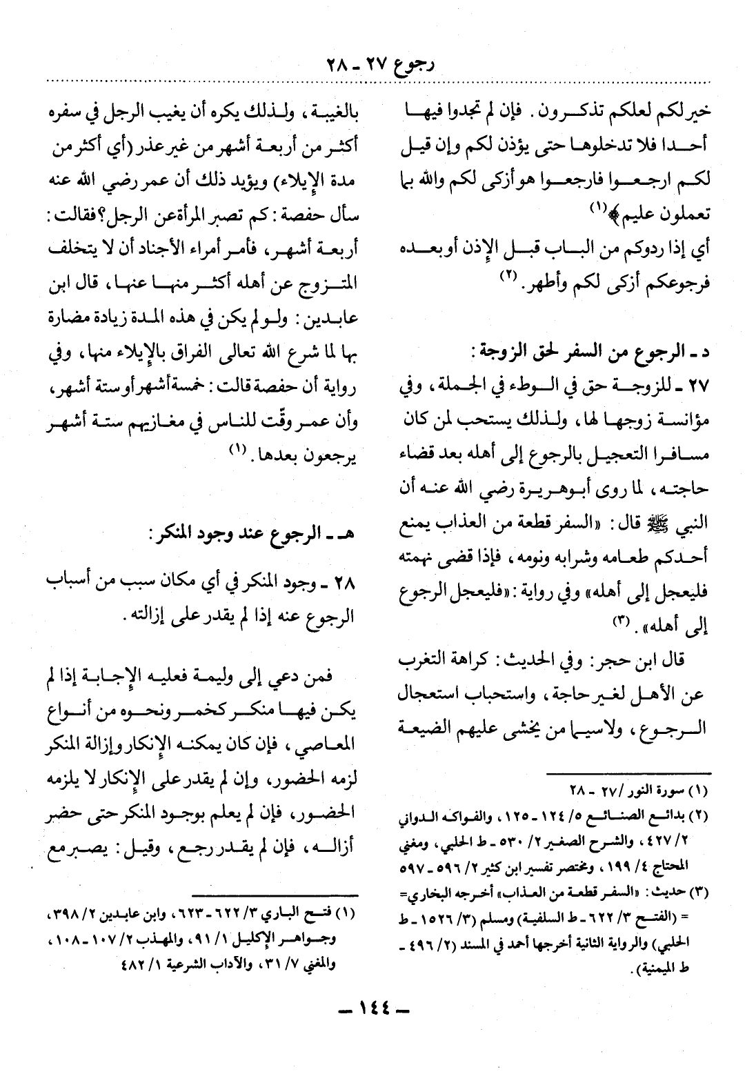 27 - لِلزَّوْجَةِ حَقٌّ فِي الْوَطْءِ فِي الْجُمْلَةِ، وَفِي مُؤَانَسَةِ زَوْجِهَا لَهَا، وَلِذَلِكَ يُسْتَحَبُّ لِمَنْ كَانَ مُسَافِرًا التَّعْجِيل بِالرُّجُوعِ إِلَى أَهْلِهِ بَعْدَ قَضَاءِ حَاجَتِهِ، لِمَا رَوَى أَبُو هُرَيْرَةَ رَضِيَ اللَّهُ عَنْهُ أَنَّ النَّبِيَّ صَلَّى اللَّهُ عَلَيْهِ وَسَلَّمَ قَال: السَّفَرُ قِطْعَةٌ مِنَ الْعَذَابِ يَمْنَعُ أَحَدَكُمْ طَعَامَهُ وَشَرَابَهُ وَنَوْمَهُ، فَإِذَا قَضَى نَهْمَتَهُ فَلْيُعَجِّل إِلَى أَهْلِهِ وَفِي رِوَايَةٍ: فَلْيُعَجِّل الرُّجُوعَ إِلَى أَهْلِهِ (3) .