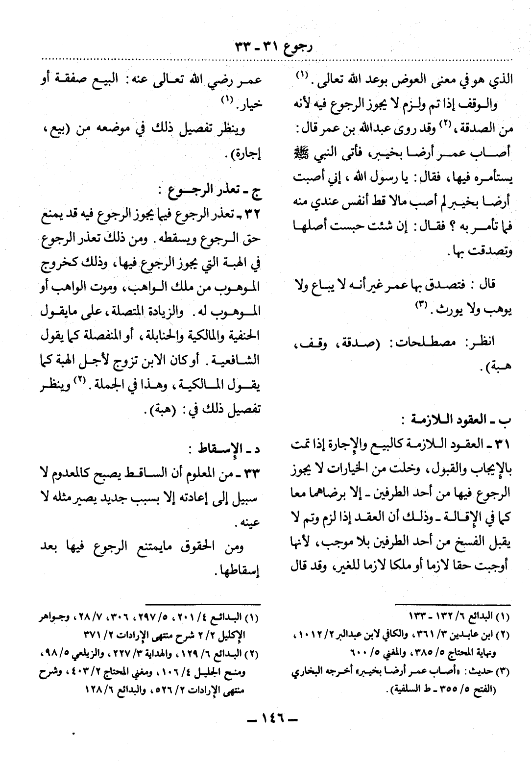 31 - الْعُقُودُ اللاَّزِمَةُ كَالْبَيْعِ وَالإِْجَارَةِ إِذَا تَمَّتْ بِالإِْيجَابِ وَالْقَبُول، وَخَلَتْ مِنَ الْخِيَارَاتِ لاَ يَجُوزُ الرُّجُوعُ فِيهَا مِنْ أَحَدِ الطَّرَفَيْنِ - إِلاَّ بِرِضَاهُمَا مَعًا كَمَا فِي الإِْقَالَةِ - وَذَلِكَ أَنَّ الْعَقْدَ إِذَا لَزِمَ وَتَمَّ لاَ يَقْبَل الْفَسْخَ مِنْ أَحَدِ الطَّرَفَيْنِ بِلاَ مُوجِبٍ؛ لأَِنَّهَا أَوْجَبَتْ حَقًّا لاَزِمًا أَوْ مِلْكًا لاَزِمًا لِلْغَيْرِ، وَقَدْ قَال
