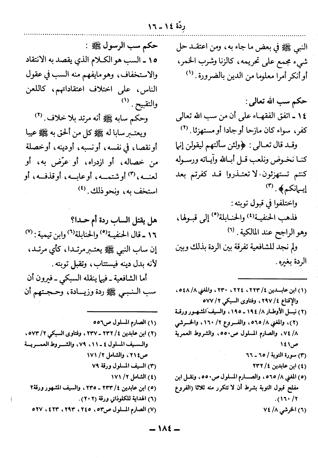 (2) نيل الأوطار 8 / 194 - 195، والسيف المشهور ورقة (2) ، والمغني 8 / 565، والفروع 2 / 160، والخرشي 8 / 74، والصارم المسلول ص 550، والشروط العمرية ص 141.