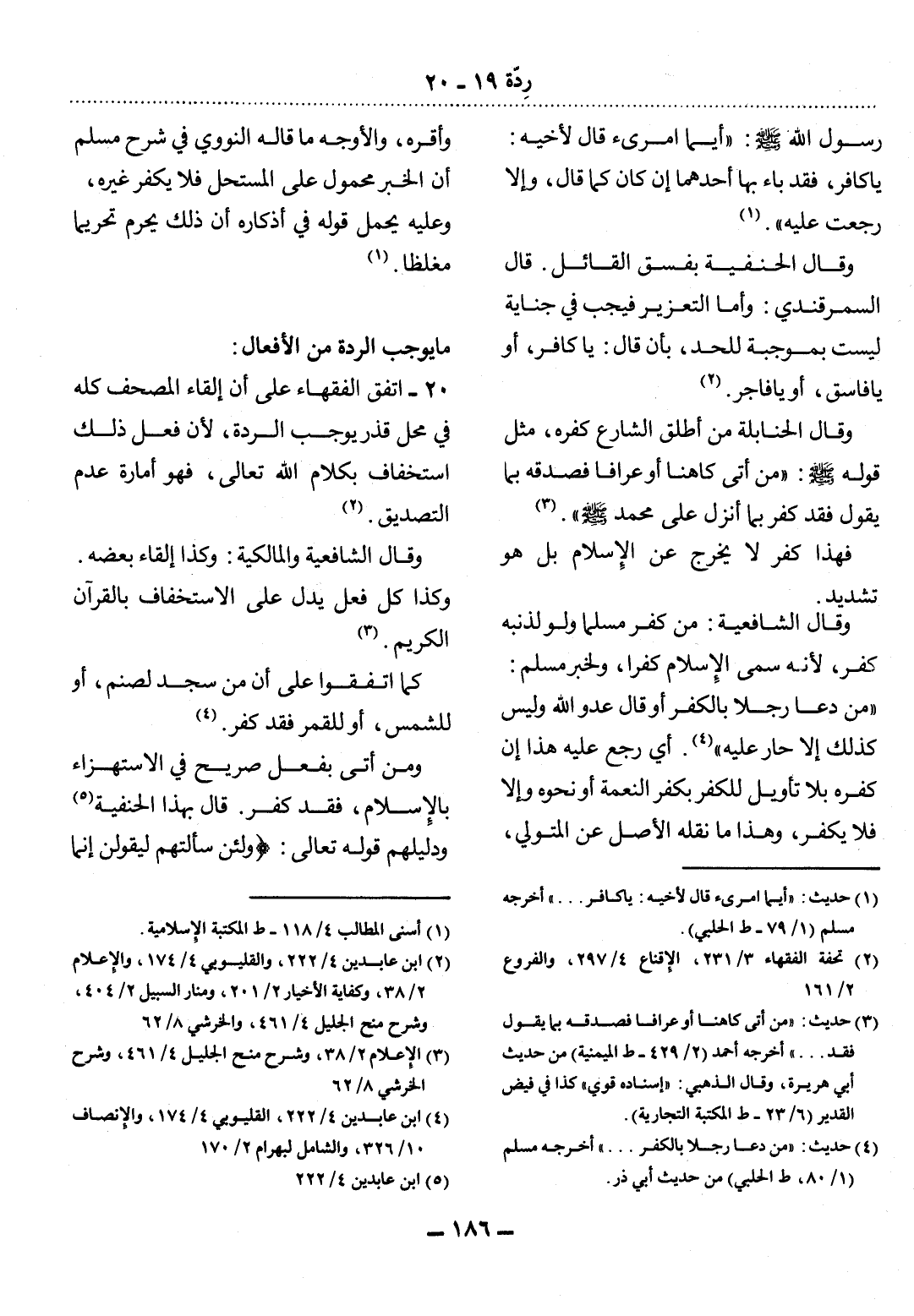 رَسُول اللَّهِ صَلَّى اللَّهُ عَلَيْهِ وَسَلَّمَ: أَيُّمَا امْرِئٍ قَال لأَِخِيهِ: يَا كَافِرُ، فَقَدْ بَاءَ بِهَا أَحَدُهُمَا إِنْ كَانَ كَمَا قَال، وَإِلاَّ رَجَعَتْ عَلَيْهِ (1)
