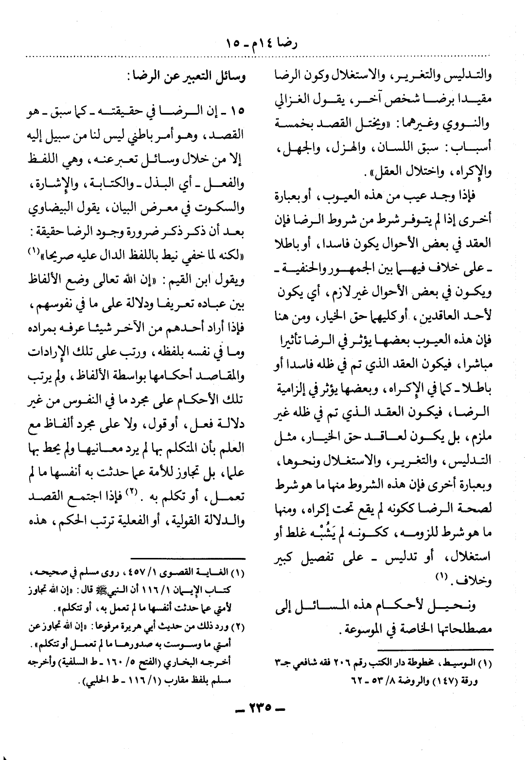 15 - إِنَّ الرِّضَا فِي حَقِيقَتِهِ - كَمَا سَبَقَ - هُوَ الْقَصْدُ، وَهُوَ أَمْرٌ بَاطِنِيٌّ لَيْسَ لَنَا مِنْ سَبِيلٍ إِلَيْهِ إِلاَّ مِنْ خِلاَل وَسَائِل تُعَبِّرُ عَنْهُ، وَهِيَ اللَّفْظُ وَالْفِعْل - أَيِ الْبَذْل - وَالْكِتَابَةُ، وَالإِْشَارَةُ، وَالسُّكُوتُ فِي مَعْرِضِ الْبَيَانِ. يَقُول الْبَيْضَاوِيُّ بَعْدَ أَنْ ذَكَرَ ضَرُورَةَ وُجُودِ الرِّضَا حَقِيقَةً: لَكِنَّهُ لَمَّا خَفِيَ نِيطَ بِاللَّفْظِ الدَّال عَلَيْهِ صَرِيحًا (1) " وَيَقُول ابْنُ الْقَيِّمِ: إِنَّ اللَّهَ تَعَالَى وَضَعَ الأَْلْفَاظَ بَيْنَ عِبَادِهِ تَعْرِيفًا وَدَلاَلَةً عَلَى مَا فِي نُفُوسِهِمْ، فَإِذَا أَرَادَ أَحَدُهُمْ مِنَ الآْخَرِ شَيْئًا عَرَّفَهُ بِمُرَادِهِ وَمَا فِي نَفْسِهِ بِلَفْظِهِ، وَرَتَّبَ عَلَى تِلْكَ الإِْرَادَاتِ وَالْمَقَاصِدِ أَحْكَامَهَا بِوَاسِطَةِ الأَْلْفَاظِ، وَلَمْ يُرَتِّبْ تِلْكَ الأَْحْكَامَ عَلَى مُجَرَّدِ مَا فِي النُّفُوسِ مِنْ غَيْرِ دَلاَلَةِ فِعْلٍ، أَوْ قَوْلٍ، وَلاَ عَلَى مُجَرَّدِ أَلْفَاظٍ مَعَ الْعِلْمِ بِأَنَّ الْمُتَكَلِّمَ بِهَا لَمْ يُرِدْ مَعَانِيَهَا وَلَمْ يُحِطْ بِهَا عِلْمًا، بَل تَجَاوَزَ لِلأُْمَّةِ عَمَّا حَدَّثَتْ بِهِ أَنْفُسَهَا مَا لَمْ تَعْمَل، أَوْ تُكَلِّمْ بِهِ (2) . فَإِذَا اجْتَمَعَ الْقَصْدُ وَالدَّلاَلَةُ الْقَوْلِيَّةُ، أَوِ الْفِعْلِيَّةُ تَرَتَّبَ الْحُكْمُ، هَذِهِ