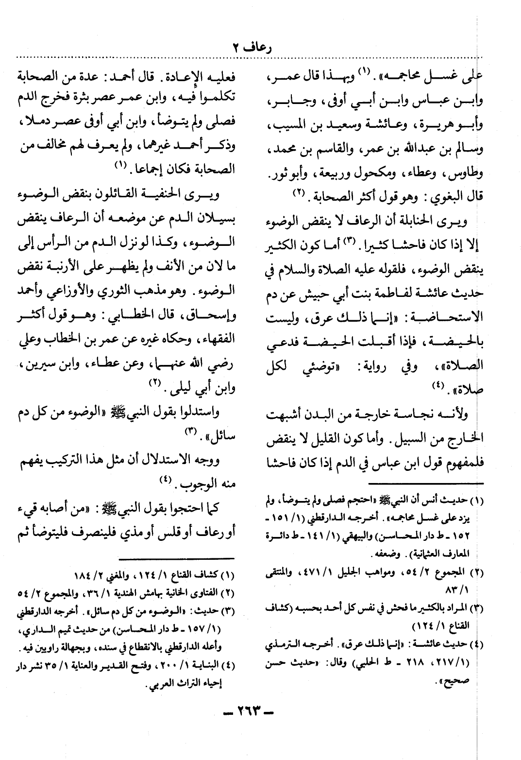 وَيَرَى الْحَنَابِلَةُ أَنَّ الرُّعَافَ لاَ يَنْقُضُ الْوُضُوءَ إِلاَّ إِذَا كَانَ فَاحِشًا كَثِيرًا (3) . أَمَّا كَوْنُ الْكَثِيرِ يَنْقُضُ الْوُضُوءَ، فَلِقَوْلِهِ عَلَيْهِ الصَّلَاةُ وَالسَّلَامُ فِي حَدِيثِ عَائِشَةَ لِفَاطِمَةَ بِنْتِ أَبِي حُبَيْشٍ عَنْ دَمِ الاِسْتِحَاضَةِ: إِنَّمَا ذَلِكَ عِرْقٌ، وَلَيْسَتْ بِالْحَيْضَةِ، فَإِذَا أَقْبَلَتِ الْحَيْضَةُ فَدَعِي الصَّلاَةَ، وَفِي رِوَايَةٍ: تَوَضَّئِي لِكُل صَلاَةٍ. (4)
