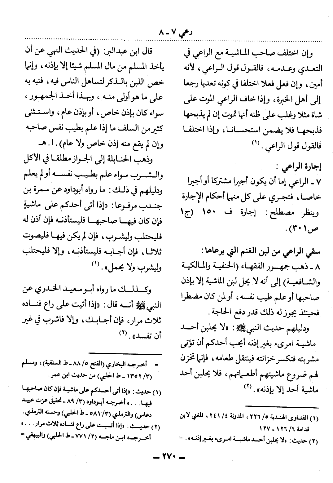 7 - الرَّاعِي إِمَّا أَنْ يَكُونَ أَجِيرًا مُشْتَرَكًا أَوْ أَجِيرًا خَاصًّا، فَتَجْرِي عَلَى كُلٍّ مِنْهُمَا أَحْكَامُ الإِْجَارَةِ وَيُنْظَرُ مُصْطَلَحُ: إِجَارَة ف. 150 (ج 1 ص 301) .