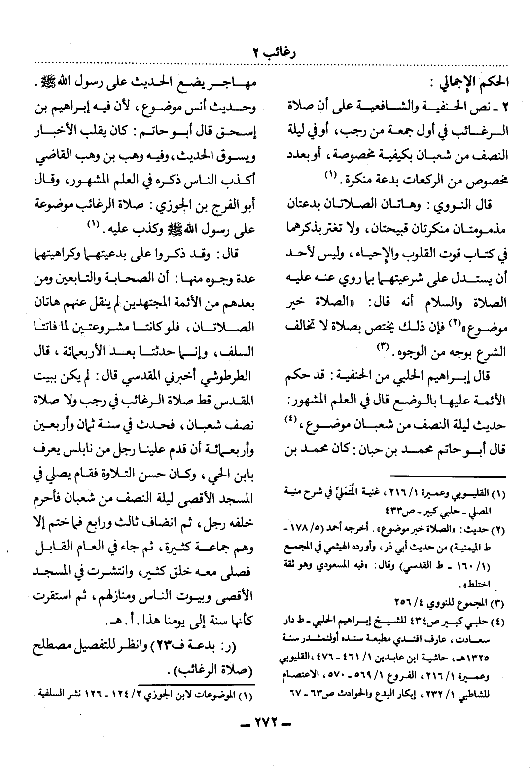 2 - نَصَّ الْحَنَفِيَّةُ وَالشَّافِعِيَّةُ عَلَى أَنَّ صَلاَةَ الرَّغَائِبِ فِي أَوَّل جُمُعَةٍ مِنْ رَجَبٍ، أَوْ فِي لَيْلَةِ النِّصْفِ مِنْ شَعْبَانَ بِكَيْفِيَّةٍ مَخْصُوصَةٍ، أَوْ بِعَدَدٍ مَخْصُوصٍ مِنَ الرَّكَعَاتِ بِدْعَةٌ مُنْكَرَةٌ (1) .