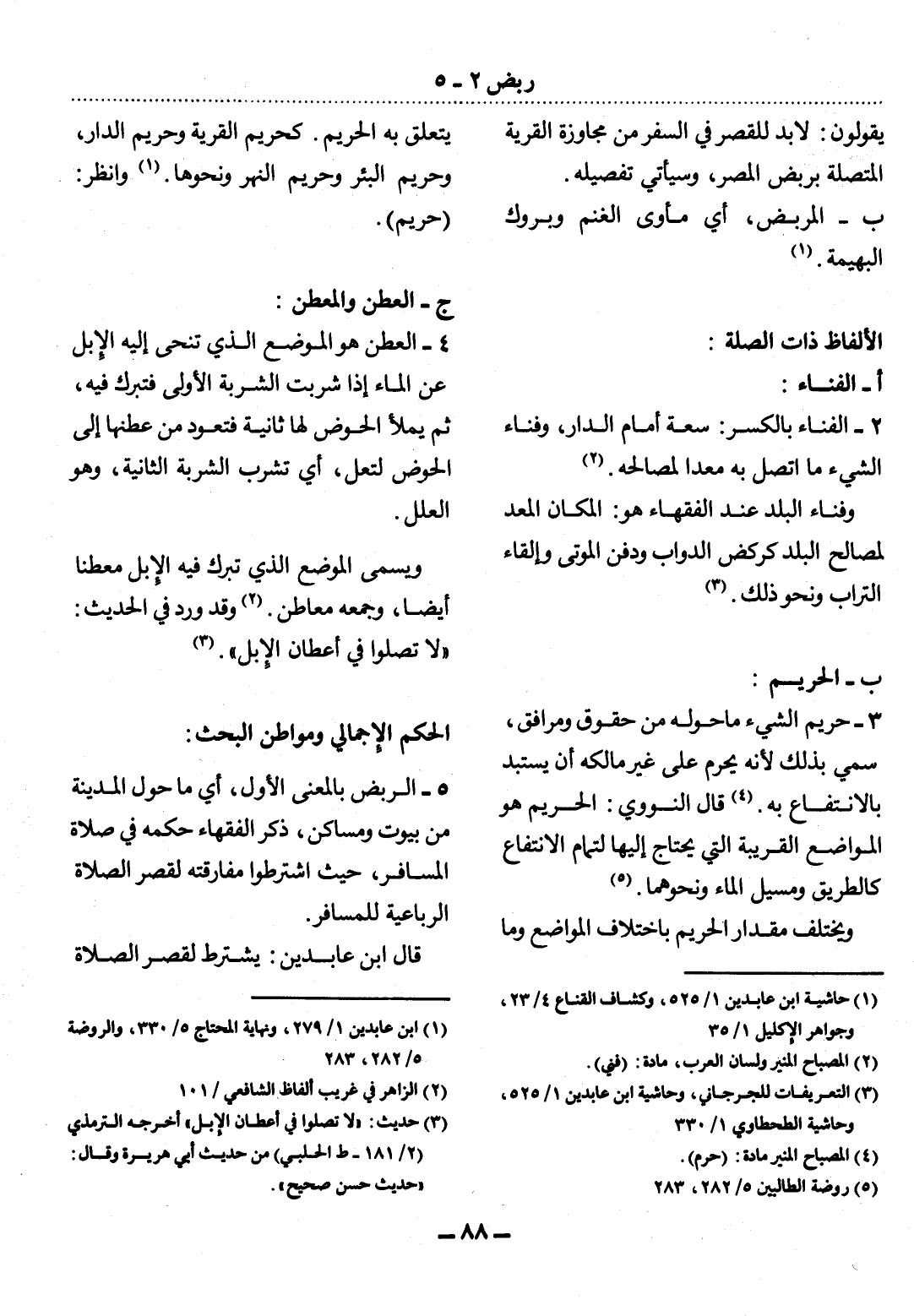 5 - الرَّبَضُ بِالْمَعْنَى الأَْوَّل، أَيْ مَا حَوْل الْمَدِينَةِ مِنْ بُيُوتٍ وَمَسَاكِنَ، ذَكَرَ الْفُقَهَاءُ حُكْمَهُ فِي صَلاَةِ الْمُسَافِرِ، حَيْثُ اشْتَرَطُوا مُفَارَقَتَهُ لِقَصْرِ الصَّلاَةِ الرُّبَاعِيَّةِ لِلْمُسَافِرِ.