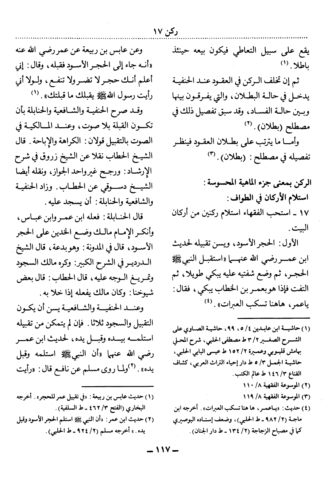 17 - اسْتَحَبَّ الْفُقَهَاءُ اسْتِلاَمَ رُكْنَيْنِ مِنْ أَرْكَانِ الْبَيْتِ.