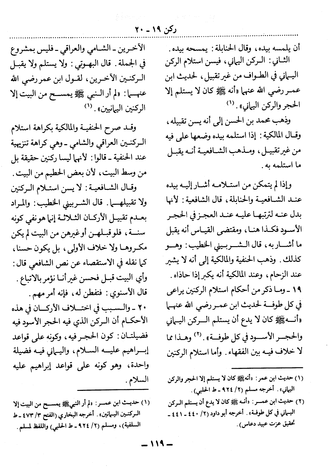 (1) حديث ابن عمر: " لم أر النبي صلى الله عليه وسلم يمسح من البيت إلا الركنين اليمانيين ". أخرجه البخاري (الفتح 3 / 473 - ط السلفية) ، ومسلم (2 / 924 - ط الحلبي) واللفظ لمسلم.