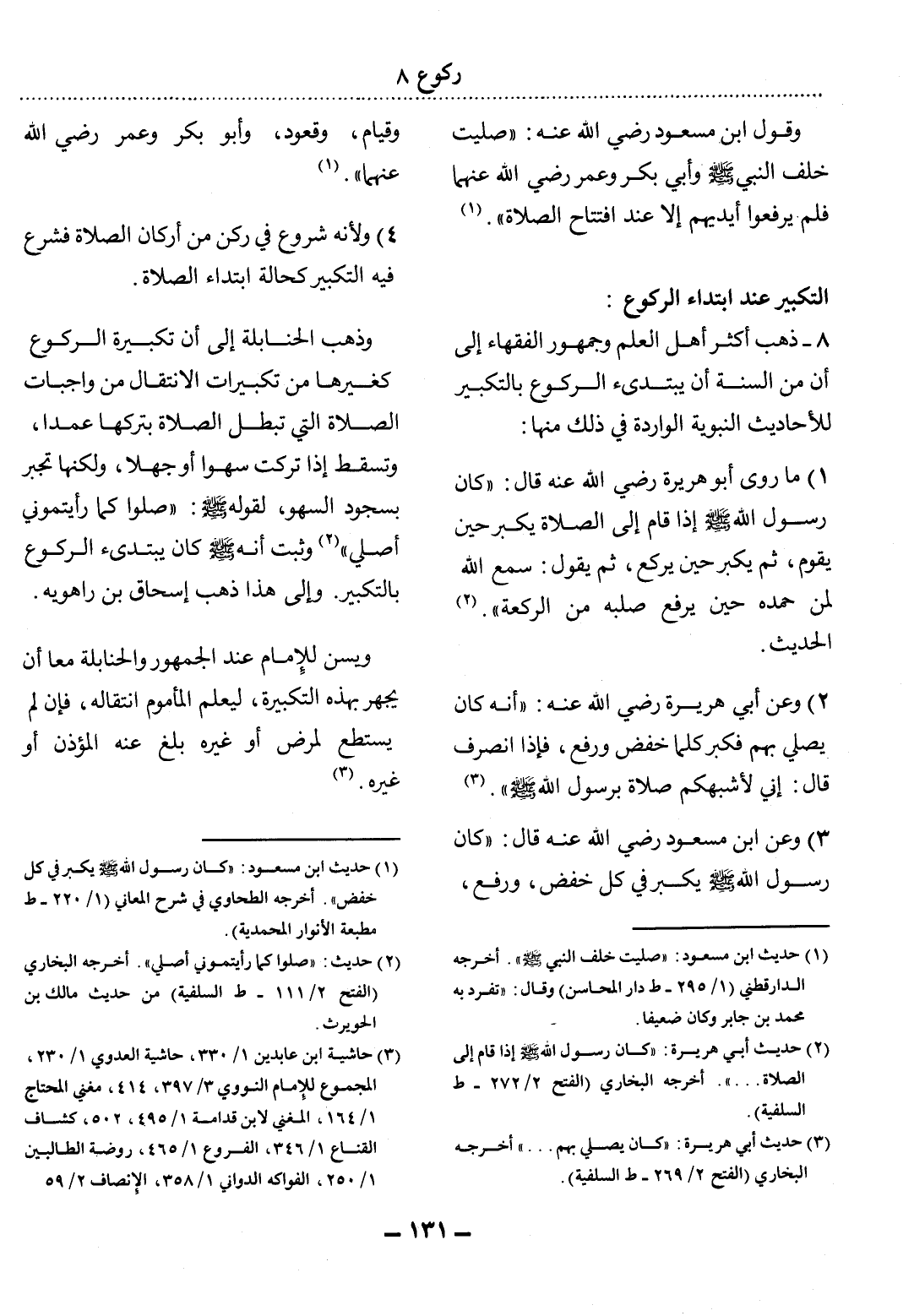 8 - ذَهَبَ أَكْثَرُ أَهْل الْعِلْمِ وَجُمْهُورُ الْفُقَهَاءِ إِلَى أَنَّ مِنَ السُّنَّةِ أَنْ يَبْتَدِئَ الرُّكُوعَ بِالتَّكْبِيرِ لِلأَْحَادِيثِ النَّبَوِيَّةِ الْوَارِدَةِ فِي ذَلِكَ مِنْهَا:
