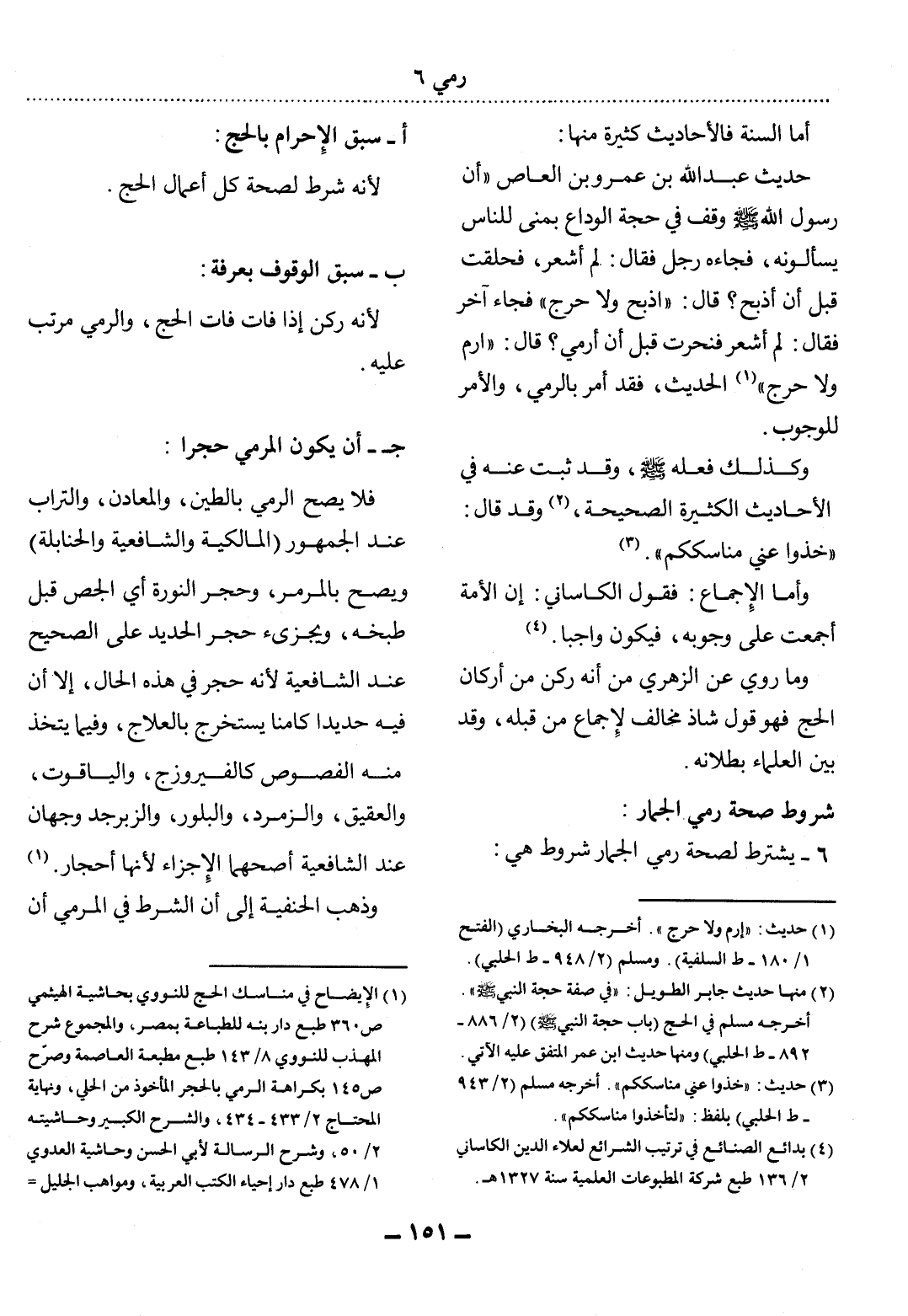 (1) الإيضاح في مناسك الحج للنووي بحاشية الهيثمي ص 360 طبع دار بنه للطباعة بمصر، والمجموع شرح المهذب للنووي 8 / 143 طبع مطبعة العاصمة وصرح ص 145 بكراهة الرمي بالحجر المأخوذ من الحلي، ونهاية المحتاج 2 / 433 - 434، والشرح الكبير وحاشيته 2 / 50، وشرح الرسالة لأبي الحسن وحاشية العدوي 1 / 478 طبع دار إحياء الكتب العربية، ومواهب الجليل لشرح مختصر خليل للحطاب والتاج والإكليل للمواق بهامشه 3 / 133 - 134، والمغني لابن قدامة 3 / 425 طبع دار المنار، والفروع لابن مفلح 3 / 510 - 511 تصوير عالم الكتب بيروت.