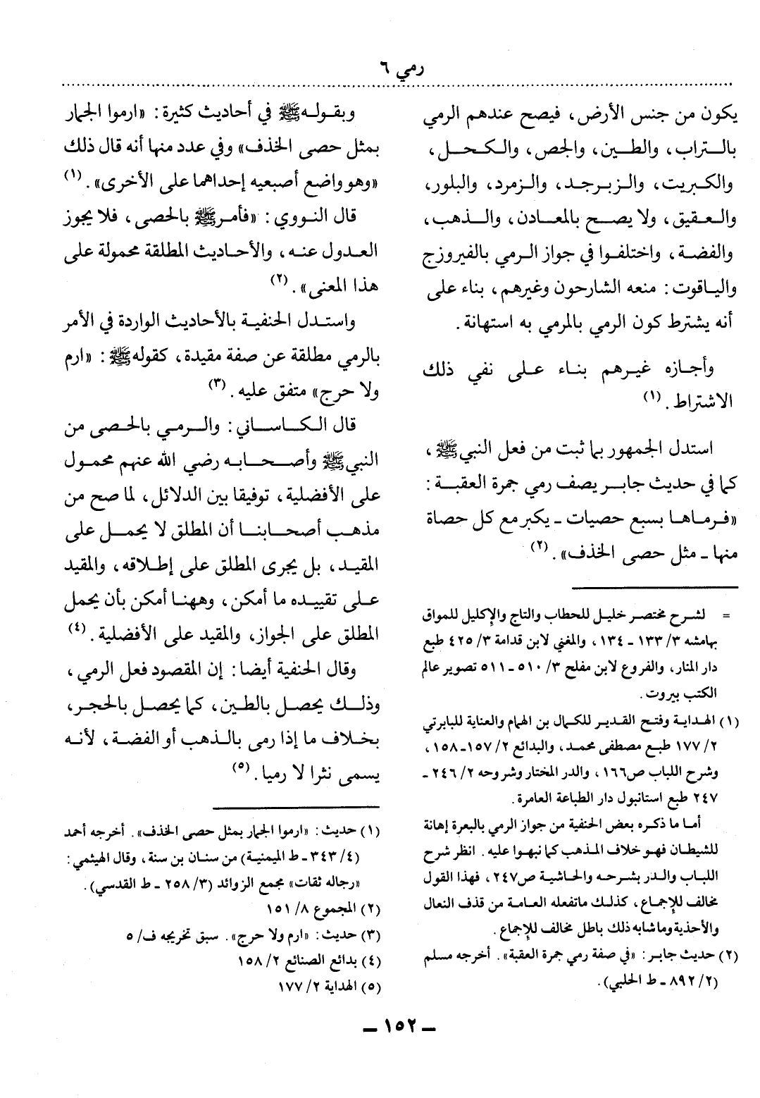 (1) الهداية وفتح القدير للكمال بن الهمام والعناية للبابرتي2 / 177 طبع مصطفى محمد، والبدائع 2 / 157 - 158، وشرح اللباب ص 166، والدر المختار وشروحه 2 / 246 - 247 طبع إستانبول دار الطباعة العامرة. أما ما ذكره بعض الحنفية من جواز الرمي بالبعرة إهانة للشيطان فهو خلاف المذهب كما نبهوا عليه. انظر شرح اللباب والدر بشرحه والحاشية ص 247، فهذا القول مخالف للإجماع، كذلك ما تفعله العامة من قذف النعال والأحذية وما شابه ذلك باطل مخالف للإجماع.