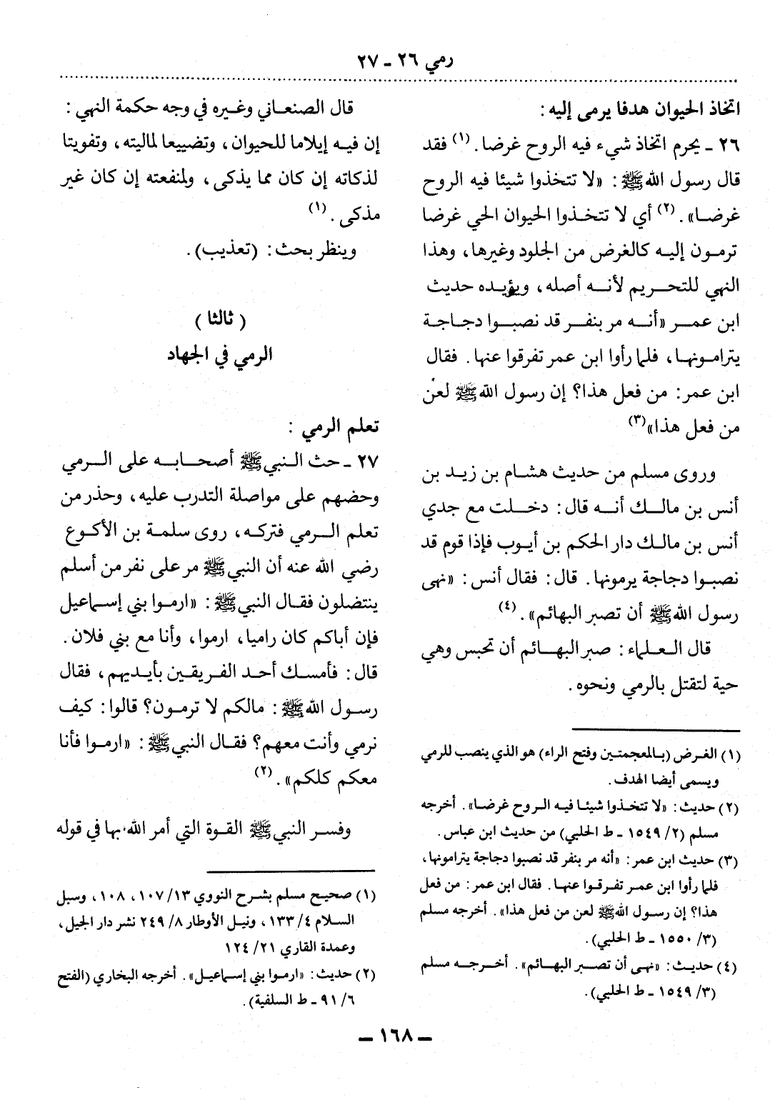 (1) حديث: " لا تتخذوا شيئًا فيه الروح غرضًا ". أخرجه مسلم (2 / 1549 - ط الحلبي) من حديث ابن عباس