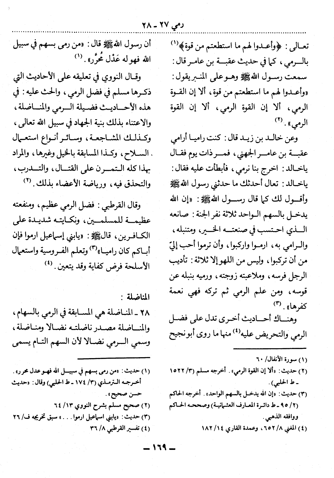 28 - الْمُنَاضَلَةُ هِيَ الْمُسَابِقَةُ فِي الرَّمْيِ بِالسِّهَامِ، وَالْمُنَاضَلَةُ مَصْدَرُ نَاضَلْتُهُ نِضَالاً وَمُنَاضَلَةً، وَسُمِّيَ الرَّمْيُ نِضَالاً لأَِنَّ السَّهْمَ التَّامَّ يُسَمَّى