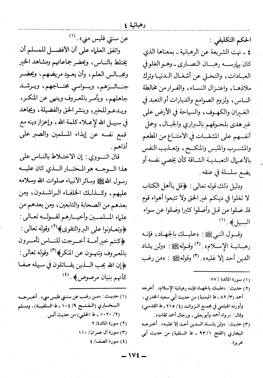 4 - نَهَتِ الشَّرِيعَةُ عَنِ الرَّهْبَانِيَّةِ - بِمَعْنَاهَا الَّذِي كَانَ يُمَارِسُهُ رُهْبَانُ النَّصَارَى - وَهُوَ الْغُلُوُّ فِي الْعِبَادَاتِ، وَالتَّخَلِّي عَنْ أَشْغَال الدُّنْيَا وَتَرْكُ مَلاَذِّهَا، وَاعْتِزَال النِّسَاءِ، وَالْفِرَارُ مِنْ مُخَالَطَةِ النَّاسِ، وَلُزُومُ الصَّوَامِعِ وَالدِّيَارَاتِ أَوِ التَّعَبُّدُ فِي الْغِيرَانِ وَالْكُهُوفِ، وَالسِّيَاحَةُ فِي الأَْرْضِ عَلَى غَيْرِ هُدًى بِلُحُوقِهِمْ بِالْبَرَارِيِّ وَالْجِبَال، وَحَمْل أَنْفُسِهِمْ عَلَى الْمَشَقَّاتِ فِي الاِمْتِنَاعِ مِنَ الْمَطْعَمِ وَالْمَشْرَبِ وَالْمَلْبَسِ وَالْمَنْكَحِ، وَتَعْذِيبُ النَّفْسِ بِالأَْعْمَال التَّعَبُّدِيَّةِ الشَّاقَّةِ كَأَنْ يَخْصِيَ نَفْسَهُ أَوْ يَضَعَ سَلْسَلَةً فِي عُنُقِهِ.