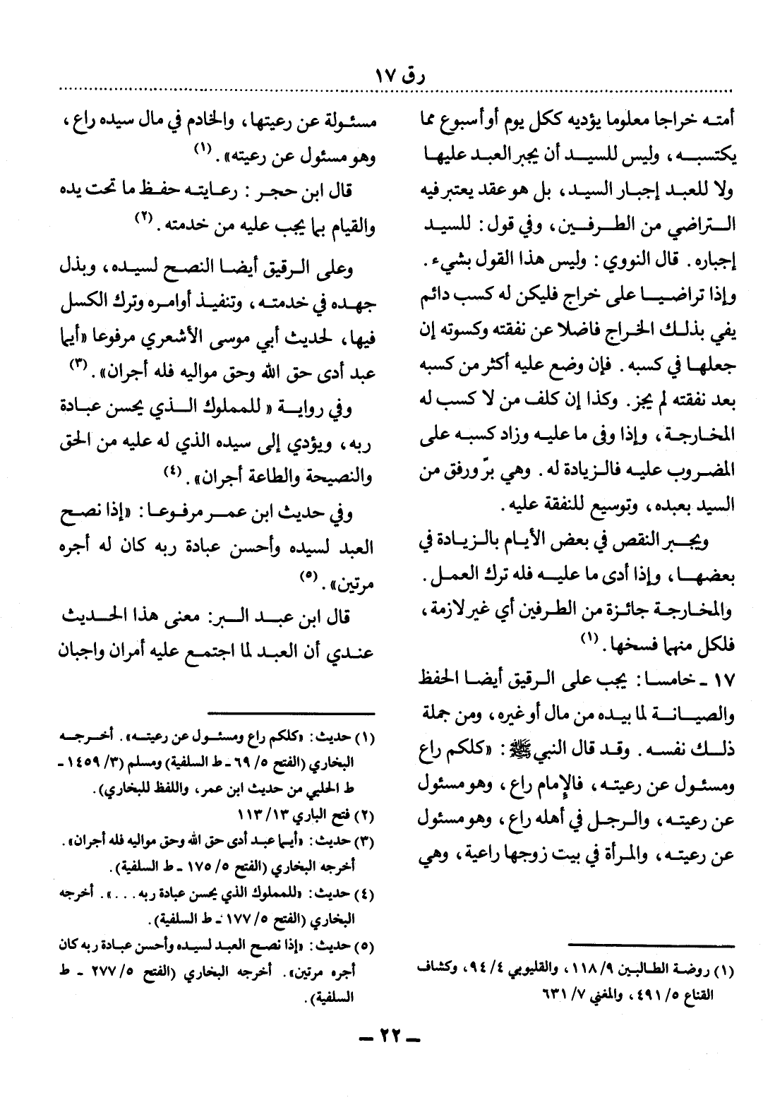 17 - خَامِسًا: يَجِبُ عَلَى الرَّقِيقِ أَيْضًا الْحِفْظُ وَالصِّيَانَةُ لِمَا بِيَدِهِ مِنْ مَالٍ أَوْ غَيْرِهِ، وَمِنْ جُمْلَةِ ذَلِكَ نَفْسِهِ. وَقَدْ قَال النَّبِيُّ صَلَّى اللَّهُ عَلَيْهِ وَسَلَّمَ: كُلُّكُمْ رَاعٍ وَمَسْئُولٌ عَنْ رَعِيَّتِهِ، فَالإِْمَامُ رَاعٍ، وَهُوَ مَسْئُولٌ عَنْ رَعِيَّتِهِ، وَالرَّجُل فِي أَهْلِهِ رَاعٍ، وَهُوَ مَسْئُولٌ عَنْ رَعِيَّتِهِ، وَالْمَرْأَةُ فِي بَيْتِ زَوْجِهَا رَاعِيَةٌ، وَهِيَ